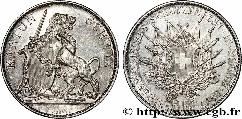 Type : 5 FrankenDate : 1857Quantité frappée : 5195Métal : argentTitre en millième : 835 ‰Diamètre : 37 mmAxe des coins : 6 h.Poids : 25,07 g.Tranche : canneléeDegré de rareté : R1Commentaires sur l’état de conservation :Traces de nettoyage, agréables reliefsRéférence ouvrage :KM/WC.19/S4 – HMZ.2-2-1343b AversTitulature avers : EIDGENOSISCHES – FREISCHIESSEN – IN BERN 1_57. // 5 FRANKEN.Description avers : Deux fusils entrecroisés devant la Crois Suisse, dans une couronne de chêne.ReversTitulature revers : EHRE IST NEIN – HOECHSTES ZIEN..Description revers : Garde suisse debout à gauche tenant un fusil.HistoriqueSUISSE – CANTON DE BERNELa Suisse est rentrée dans l’orbite française depuis 1799 après la défaite de Zürich contre Souvarov. Un système de République « Sœur » est imposé aux Cantons et Genève est annexée à la France. La Confédération Helvètique quitte l’alliance française en 1813 et recouvre son indépendance et les cantons leur liberté. Berne, qui avait été un poste militaire dès 1191 avant de devenir une ville impériale, reçoit le droit de frapper monnaie en 1218 et entre dans la Confédération en 1353.