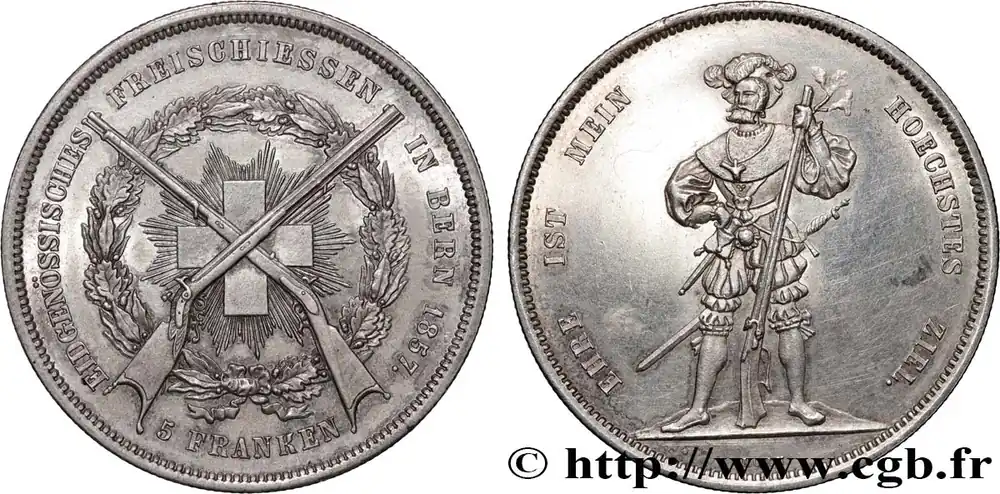 Type : 5 FrankenDate : 1857Quantité frappée : 5195Métal : argentTitre en millième : 835 ‰Diamètre : 37 mmAxe des coins : 6 h.Poids : 25,07 g.Tranche : canneléeDegré de rareté : R1Commentaires sur l’état de conservation :Traces de nettoyage, agréables reliefsRéférence ouvrage :KM/WC.19/S4 – HMZ.2-2-1343b AversTitulature avers : EIDGENOSISCHES – FREISCHIESSEN – IN BERN 1_57. // 5 FRANKEN.Description avers : Deux fusils entrecroisés devant la Crois Suisse, dans une couronne de chêne.ReversTitulature revers : EHRE IST NEIN – HOECHSTES ZIEN..Description revers : Garde suisse debout à gauche tenant un fusil.HistoriqueSUISSE – CANTON DE BERNELa Suisse est rentrée dans l’orbite française depuis 1799 après la défaite de Zürich contre Souvarov. Un système de République « Sœur » est imposé aux Cantons et Genève est annexée à la France. La Confédération Helvètique quitte l’alliance française en 1813 et recouvre son indépendance et les cantons leur liberté. Berne, qui avait été un poste militaire dès 1191 avant de devenir une ville impériale, reçoit le droit de frapper monnaie en 1218 et entre dans la Confédération en 1353.