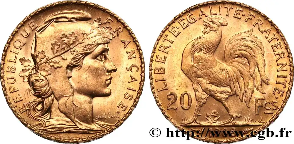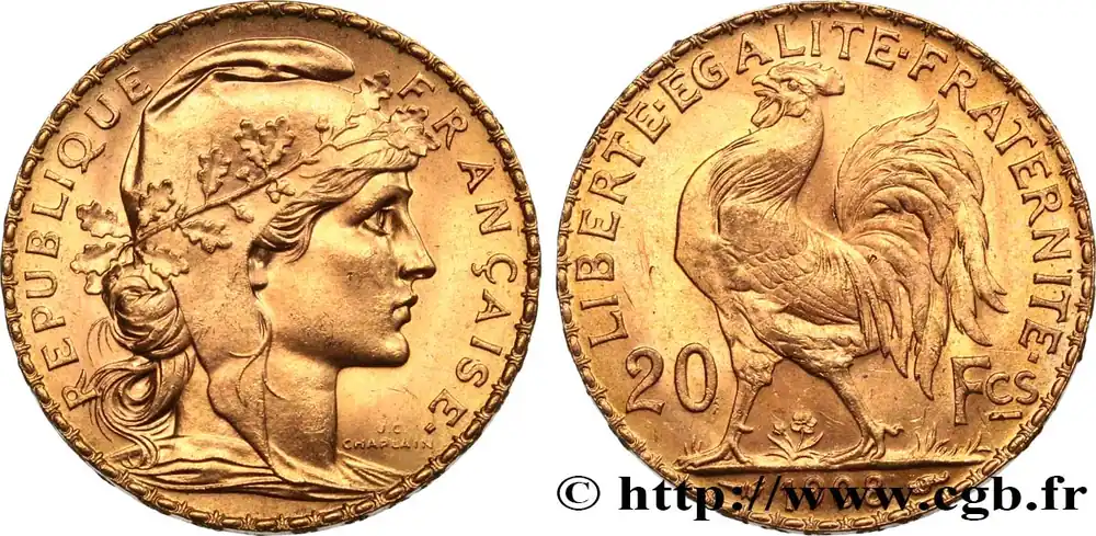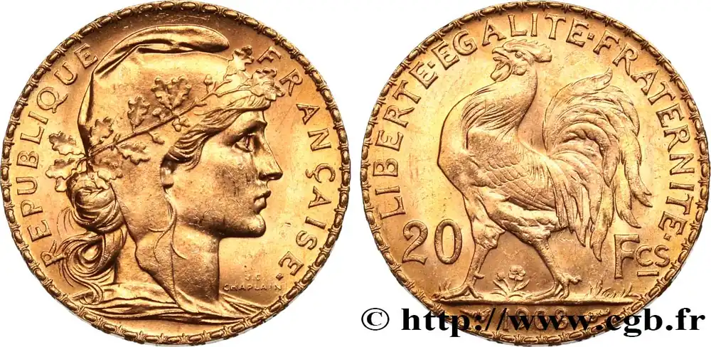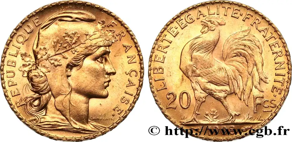 Type : 20 francs or Coq, Liberté Égalité FraternitéDate : 1914Nom de l’atelier/ville : ParisQuantité frappée : 6720141Métal : orTitre en millième : 900 ‰Diamètre : 21 mmAxe des coins : 6 h.Poids : 6,45 g.Tranche : inscrite en relief +* LIBERTE +* EGALITE +* FRATERNITE *+Référence ouvrage :Classement FRANC 2023 / FRANC 2023 classificationF.535/8AversTitulature avers : REPUBLIQUE – FRANÇAISE..Description avers : Buste de Marianne drapée à droite, coiffée du bonnet phrygien décoré d’une branche de chêne ; signé J.C. CHAPLAIN devant le cou.ReversTitulature revers : LIBERTE EGALITE FRATERNITE // 20 – FCS // 1914.Description revers : Coq passant à gauche, date à l’exergue.HistoriqueOR, PALLADIUM ET PLATINE INVESTISSEMENTSécurisez et diversifiez votre épargne avec les métaux précieux :Dans un contexte d’instabilité politique et économique croissante, diversifier son épargne peut être une démarche judicieuse. Les métaux précieux comme l’or, le palladium et le platine constituent des actifs tangibles souvent prisés en raison de leur caractère intemporel et de leur résilience face aux fluctuations des marchés.Pour répondre à des besoins variés, l’achat de pièces officielles en or, palladium ou platine est une option flexible et adaptée. Ces pièces, disponibles à l’unité ou en lot, permettent à chacun d’ajuster ses choix selon ses objectifs et son budget, sans engagement à long terme.Un processus simple et sécurisé :Nous proposons une livraison sécurisée et garantie. Les paiements peuvent être effectués par carte bancaire ou par virement, bien que certaines transactions puissent nécessiter un règlement exclusivement par virement bancaire. Une pièce d’identité valide (carte nationale d’identité ou passeport) sera demandée pour finaliser votre achat.Stockage en toute sécurité et confidentialité :Le département Investissement de CGB Numismatique Paris met à votre disposition des solutions de stockage offrant une sécurité renforcée et une confidentialité optimale pour vos achats en or, palladium et platine.Contactez-nous pour plus d’informations :Pour toute question ou pour passer commande, prenez contact avec notre responsable des achats/ventes de métaux précieux : par email à [email protected] ou par téléphone. Nous mettons à votre disposition des informations générales et des services pour vous accompagner dans vos projets d’investissement.CGB Numismatique Paris agit en tant que fournisseur de métaux précieux et ne fournit aucun conseil en investissement. La valeur des métaux précieux peut fluctuer, et les performances passées ne garantissent pas les résultats futurs. L’achat de métaux précieux doit être considéré comme une stratégie de préservation de valeur plutôt qu’un investissement spéculatif. Conformément à l’article L.221-28 du Code de la consommation, le droit de rétractation ne s’applique pas aux achats d’or d’investissement, dont le prix dépend des fluctuations des marchés financiers.