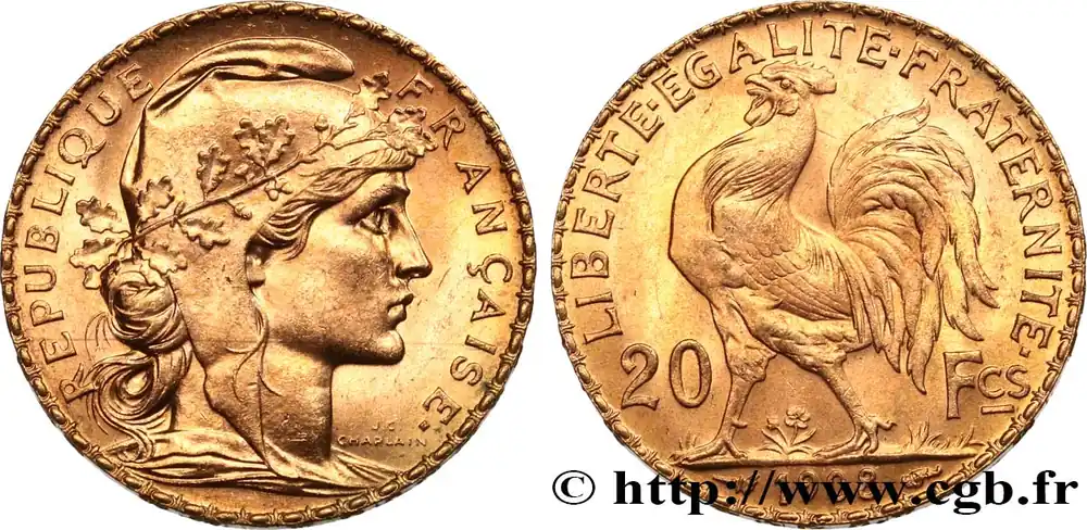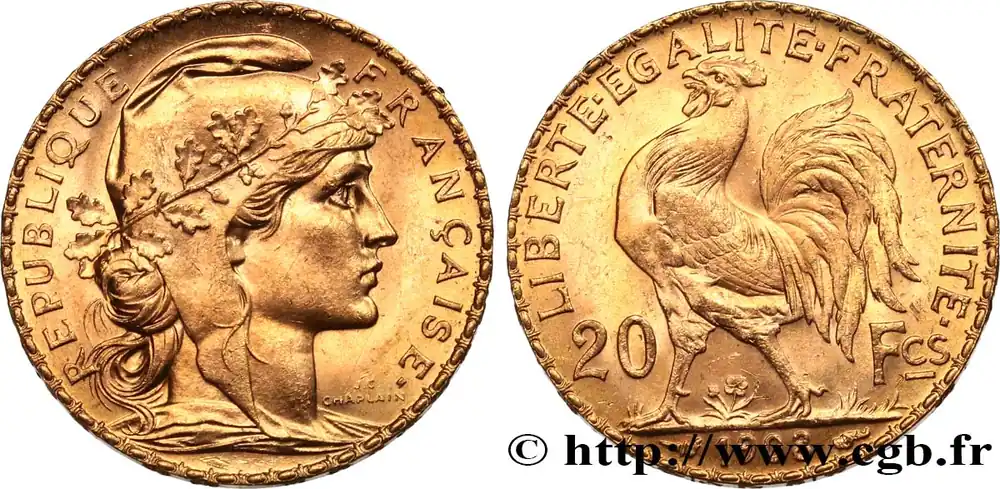 Type : 20 francs or Coq, Liberté Égalité FraternitéDate : 1914Nom de l’atelier/ville : ParisQuantité frappée : 6720141Métal : orTitre en millième : 900 ‰Diamètre : 21 mmAxe des coins : 6 h.Poids : 6,45 g.Tranche : inscrite en relief +* LIBERTE +* EGALITE +* FRATERNITE *+Référence ouvrage :Classement FRANC 2023 / FRANC 2023 classificationF.535/8AversTitulature avers : REPUBLIQUE – FRANÇAISE..Description avers : Buste de Marianne drapée à droite, coiffée du bonnet phrygien décoré d’une branche de chêne ; signé J.C. CHAPLAIN devant le cou.ReversTitulature revers : LIBERTE EGALITE FRATERNITE // 20 – FCS // 1914.Description revers : Coq passant à gauche, date à l’exergue.HistoriqueOR, PALLADIUM ET PLATINE INVESTISSEMENTSécurisez et diversifiez votre épargne avec les métaux précieux :Dans un contexte d’instabilité politique et économique croissante, diversifier son épargne peut être une démarche judicieuse. Les métaux précieux comme l’or, le palladium et le platine constituent des actifs tangibles souvent prisés en raison de leur caractère intemporel et de leur résilience face aux fluctuations des marchés.Pour répondre à des besoins variés, l’achat de pièces officielles en or, palladium ou platine est une option flexible et adaptée. Ces pièces, disponibles à l’unité ou en lot, permettent à chacun d’ajuster ses choix selon ses objectifs et son budget, sans engagement à long terme.Un processus simple et sécurisé :Nous proposons une livraison sécurisée et garantie. Les paiements peuvent être effectués par carte bancaire ou par virement, bien que certaines transactions puissent nécessiter un règlement exclusivement par virement bancaire. Une pièce d’identité valide (carte nationale d’identité ou passeport) sera demandée pour finaliser votre achat.Stockage en toute sécurité et confidentialité :Le département Investissement de CGB Numismatique Paris met à votre disposition des solutions de stockage offrant une sécurité renforcée et une confidentialité optimale pour vos achats en or, palladium et platine.Contactez-nous pour plus d’informations :Pour toute question ou pour passer commande, prenez contact avec notre responsable des achats/ventes de métaux précieux : par email à [email protected] ou par téléphone. Nous mettons à votre disposition des informations générales et des services pour vous accompagner dans vos projets d’investissement.CGB Numismatique Paris agit en tant que fournisseur de métaux précieux et ne fournit aucun conseil en investissement. La valeur des métaux précieux peut fluctuer, et les performances passées ne garantissent pas les résultats futurs. L’achat de métaux précieux doit être considéré comme une stratégie de préservation de valeur plutôt qu’un investissement spéculatif. Conformément à l’article L.221-28 du Code de la consommation, le droit de rétractation ne s’applique pas aux achats d’or d’investissement, dont le prix dépend des fluctuations des marchés financiers.