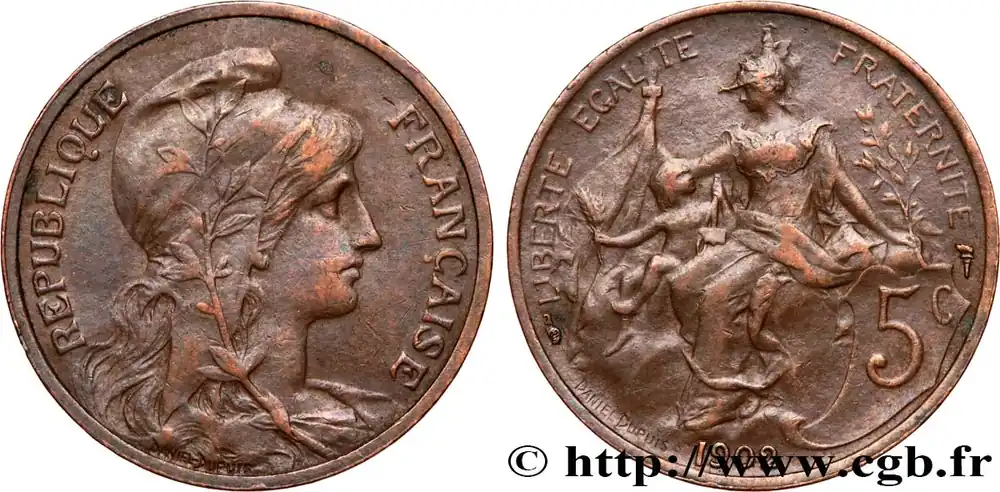 Type : 5 centimes Daniel-DupuisDate : 1904Quantité frappée : 8.000.000Métal : bronzeDiamètre : 25 mmAxe des coins : 6 h.Poids : 5 g.Tranche : lisseSlabPCGS : MS65Commentaires sur l’état de conservation :Sous coque PCGS MS65RBRéférence ouvrage :Classement FRANC 2023 / FRANC 2023 classificationF.119/14AversTitulature avers : REPUBLIQUEFRANÇAISE.Description avers : buste habillé de la République aux cheveux longs à droite, portant un bonnet phrygien maintenu par un ruban ; une branche d’olivier montant depuis le buste et passée dans le ruban du bonnet ; au-dessous DANIEL DUPUIS en creux.ReversTitulature revers : LIBERTE EGALITEFRATERNITE.Description revers : la République cuirassée d’apparat avec Gorgone à l’égide, laurée, drapée et casquée au coq, assise à gauche sur un rocher, tenant de sa main droite un drapeau-étendard marqué RF sur l’enseigne et de sa main gauche une branche d’olivier ; à sa droite, un enfant nu la regarde, tenant des épis de blé de la main droite, lui présentant un marteau et des pinces de la main gauche ; à l’exergue DANIEL DUPUIS en creux et le millésime ; 5 c sur un cartouche recouvrant le rocher.CommentaireDe qualité équivalente à l’actuel exemplaire de la Collection Idéale.HistoriqueTROISIÈME RÉPUBLIQUE(4/09/1870-10/07/1940) La nouvelle de la capitulation de Sedan provoque la révolution du 4 septembre 1870 à Paris. Proclamée à l’Hôtel de Ville, la République est dotée d’un gouvernement provisoire appelé gouvernement de la Défense nationale. Menacé à gauche par l’insurrection de la Commune et à droite par les monarchistes, le nouveau régime connaît des débuts difficiles. Chef du pouvoir exécutif dans un premier temps (février 1871), Thiers est chargé de réorganiser le pays avant de choisir sa forme de gouvernement. Il devient président de la République en août 1871 et, malgré son action de libération du territoire, doit quitter son poste en mars 1873 face à l’opposition royaliste. Il est alors remplacé par Mac-Mahon favorable au rétablissement de la monarchie mais celle-ci n’est pas restaurée à la suite de la question du drapeau. La loi du septennat est alors mise en place en novembre 1873 puis, en 1875, sont votées les lois fondamentales qui servent de Constitution à la Troisième République. Régime parlementaire, elle se caractérise notamment par la nette prépondérance du pouvoir législatif sur le pouvoir exécutif. Anticléricale, la Troisième République rend l’école gratuite, laïque et obligatoire mais continue la politique coloniale pour ses ambitions économiques, stratégiques et morales. La séparation des Églises et de l’État est votée en 1905. L’idée d’une revanche sur l’Allemagne et un nationalisme important sont au cœur de la crise boulangiste, du scandale de Panama ou de l’affaire Dreyfus des années 1886-1899 tandis que la politique étrangère est très active notamment au Maroc et que la course aux armements se développe. La Première Guerre mondiale coûte cher à la France qui ne se relève qu’à partir de 1920 voire 1928 pour la monnaie avec le franc « Poincaré ». La crise de 1929 ne se fait sentir qu’à partir de 1932 mais dure jusqu’en 1939, période durant laquelle l’instabilité ministérielle est très importante. Vacillant en 1934, la Troisième République trouve un nouveau ciment unitaire avec l’antifascisme qui permet l’arrivée au pouvoir du Front populaire en 1936. Mais, paralysée face à l’Allemagne, la France va alors s’enliser dans une « drôle de guerre » puis connaître l’une des plus grandes défaites de son histoire en juin 1940. Réunies en Assemblée nationale à Vichy le 10 juillet 1940, les Chambres, pourtant élues en 1936, votent les pleins pouvoirs à Pétain dans une sorte de suicide collectif par 569 voix pour, 80 voix contre et 18 abstentions.