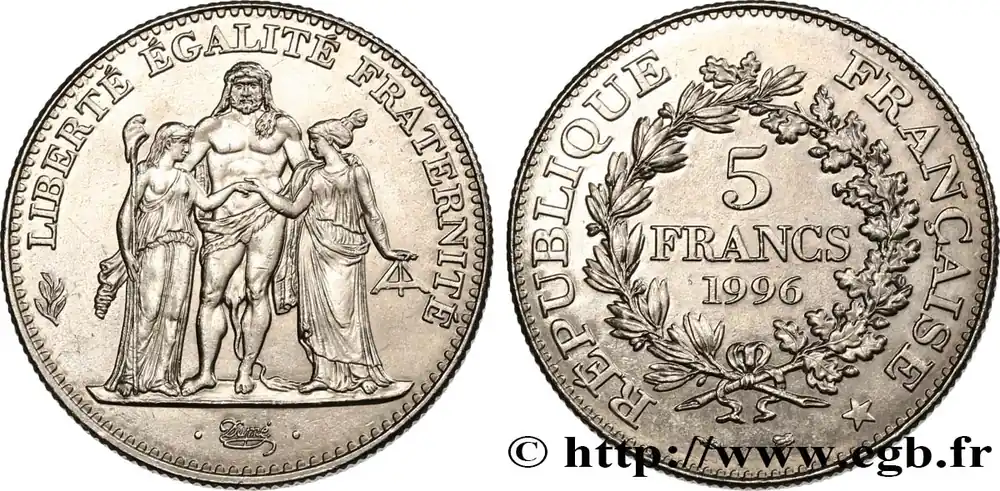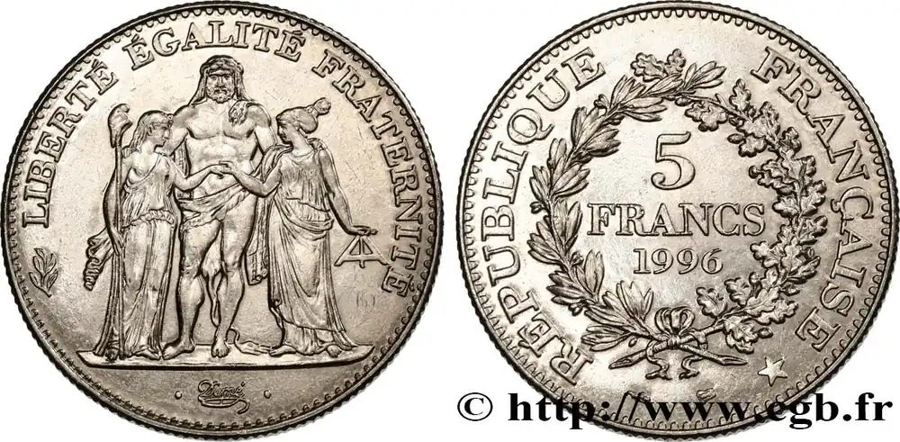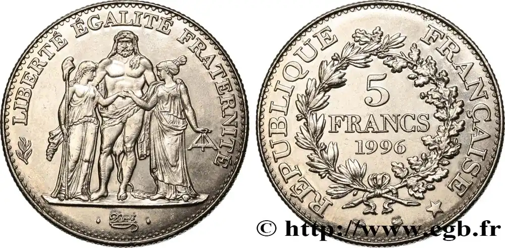 Type : 5 francs Hercule de DupréDate : 1996Quantité frappée : 4976213Métal : cupro-nickelDiamètre : 29 mmPoids : 9,97 g.Tranche : striéeRéférence ouvrage :Classement FRANC 2023 / FRANC 2023 classificationF.346/2AversTitulature avers : (FEUILLE D’OLIVIER) LIBERTÉ ÉGALITÉ FRATERNITÉ.Description avers : Hercule nu avec la léonté, unissant la Liberté debout à gauche tenant la main de Justice et l’Egalité à droite, tenant le niveau ; signé *Dupré cursif* à l’exergue.ReversTitulature revers : REPUBLIQUE – FRANÇAISE // 5 / FRANCS / 1996.Description revers : dans une couronne formée d’une branche d’olivier et d’une branche de chêne.HistoriqueCINQUIÈME RÉPUBLIQUE(depuis le 08/01/1959) La Cinquième République, dont la constitution a été approuvée par référendum le 28 septembre 1958 par plus de 79 % des Français, ne débute officiellement qu’avec l’installation du général de Gaulle comme président le 8 janvier 1959. La constitution est modifiée le 28 octobre 1962 par référendum où une majorité de 62 % des voix approuve l’élection du président de la République au suffrage universel direct. Les différents présidents de la Ve République sont Charles de Gaulle (8/01/1959 – 27/04/1969, retrait et Alain Poher devient président par intérim), Georges Pompidou (15/06/1969 – 2/04/1974, décédé, Alain Poher devient président par intérim), Valéry Giscard d’Estaing (19/05/1974 – 21/05/1981), François Mitterrand (21/05/1981 – 7/05/1995), Jacques Chirac (7/05/1995 – 16/05/2007) , Nicolas Sarkozy (16/05/2007 – 15/05/2012), François Hollande (15/05/2012 – 14/05/2017) et Emmanuel Macron (14/05/2017 – ).