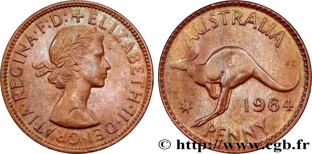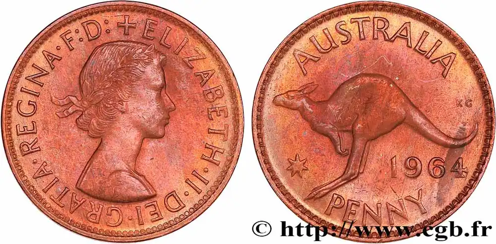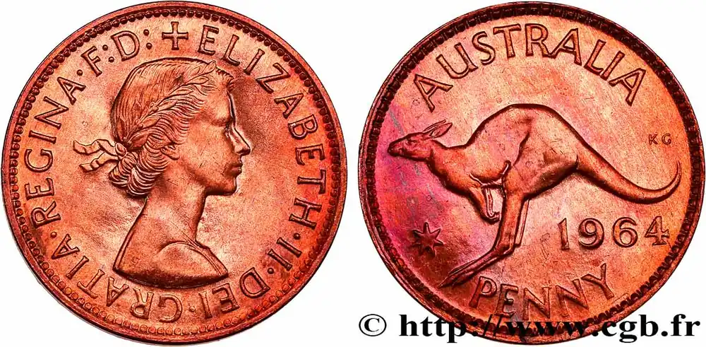 Type : 1 Penny Elisabeth IIDate : 1964Nom de l’atelier/ville : PerthQuantité frappée : 49130000Métal : bronzeDiamètre : 30,5 mmAxe des coins : 12 h.Poids : 5,67 g.Tranche : lisseRéférence ouvrage :KM20/56 AversTitulature avers : ELISABETH.II..DEI.GRATIA.REGINA.Description avers : buste à droite de la reine Élisabeth II.ReversTitulature revers : AUSTRALIA // 1964 / PENNY.Description revers : kangourou à gauche.HistoriqueAUSTRALIE