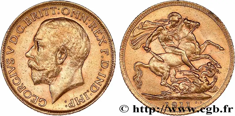 Type : 1 Souverain Georges VDate : 1911Nom de l’atelier/ville : LondresQuantité frappée : 30044000Métal : orTitre en millième : 917 ‰Diamètre : 22 mmAxe des coins : 12 h.Poids : 7,98 g.Tranche : canneléeCommentaires sur l’état de conservation :Traces de nettoyageRéférence ouvrage :Sp.3996  – KM20/820 AversTitulature avers : GEORGIVS V D G BRITT: OMN: REX F. D. IND: IMP:.Description avers : Tête nue de Georges V à gauche.Traduction avers : (Georges V par la grâce de Dieu roi de tous les Bretons, défenseur de la Foi, empereur des Indes).ReversTitulature revers : 1911 À L’EXERGUE.Description revers : Saint Georges, nu, casqué, le manteau flottant sur l’épaule, tenant un glaive de la main droite, galopant à droite, terrassant un dragon.HistoriqueOR, PALLADIUM ET PLATINE INVESTISSEMENTSécurisez et diversifiez votre épargne avec les métaux précieux :Dans un contexte d’instabilité politique et économique croissante, diversifier son épargne peut être une démarche judicieuse. Les métaux précieux comme l’or, le palladium et le platine constituent des actifs tangibles souvent prisés en raison de leur caractère intemporel et de leur résilience face aux fluctuations des marchés.Pour répondre à des besoins variés, l’achat de pièces officielles en or, palladium ou platine est une option flexible et adaptée. Ces pièces, disponibles à l’unité ou en lot, permettent à chacun d’ajuster ses choix selon ses objectifs et son budget, sans engagement à long terme.Un processus simple et sécurisé :Nous proposons une livraison sécurisée et garantie. Les paiements peuvent être effectués par carte bancaire ou par virement, bien que certaines transactions puissent nécessiter un règlement exclusivement par virement bancaire. Une pièce d’identité valide (carte nationale d’identité ou passeport) sera demandée pour finaliser votre achat.Stockage en toute sécurité et confidentialité :Le département Investissement de CGB Numismatique Paris met à votre disposition des solutions de stockage offrant une sécurité renforcée et une confidentialité optimale pour vos achats en or, palladium et platine.Contactez-nous pour plus d’informations :Pour toute question ou pour passer commande, prenez contact avec notre responsable des achats/ventes de métaux précieux : par email à [email protected] ou par téléphone. Nous mettons à votre disposition des informations générales et des services pour vous accompagner dans vos projets d’investissement.CGB Numismatique Paris agit en tant que fournisseur de métaux précieux et ne fournit aucun conseil en investissement. La valeur des métaux précieux peut fluctuer, et les performances passées ne garantissent pas les résultats futurs. L’achat de métaux précieux doit être considéré comme une stratégie de préservation de valeur plutôt qu’un investissement spéculatif. Conformément à l’article L.221-28 du Code de la consommation, le droit de rétractation ne s’applique pas aux achats d’or d’investissement, dont le prix dépend des fluctuations des marchés financiers.