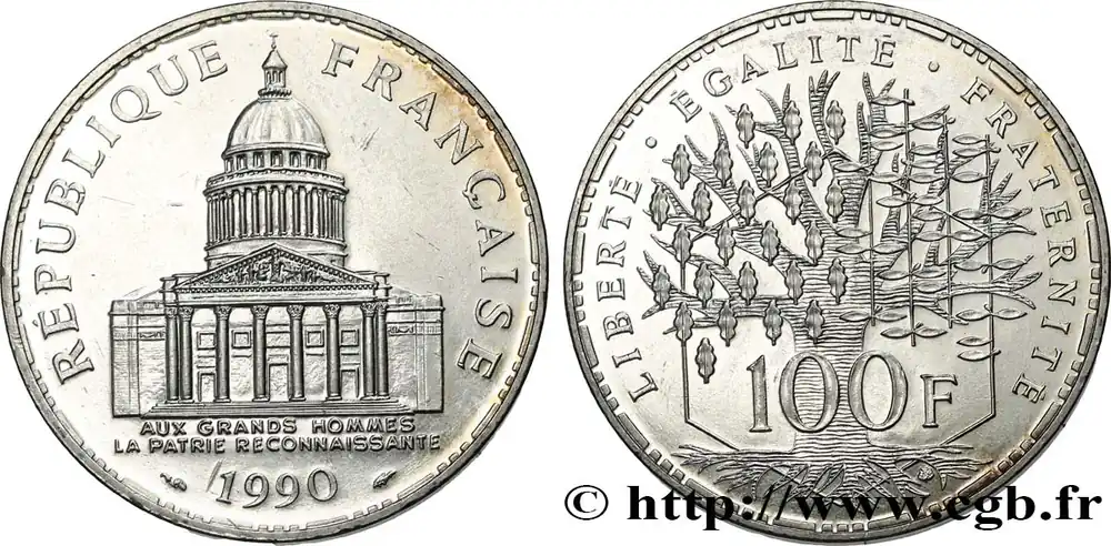 Type : 100 francs PanthéonDate : 1984Quantité frappée : 5.000.647Métal : argentDiamètre : 31 mmAxe des coins : 6 h.Poids : 15 g.Tranche : lisseRéférence ouvrage :Classement FRANC 2023 / FRANC 2023 classificationF.451/4AversTitulature avers : RÉPUBLIQUE FRANÇAISE / (MILLÉSIME) ENCADRÉ DES DIFFÉRENTS.Description avers : la façade du Panthéon posée sur la phrase de son fronton : AUX GRANDS HOMMES / LA PATRIE RECONNAISSANTE.ReversTitulature revers : LIBERTÉ . ÉGALITÉ . FRATERNITÉ / 100 F.Description revers : dans un hexagone, un arbre enraciné, chêne à gauche, olivier à droite, signé dans les racines à droite de la rosette de l’Atelier de gravure.HistoriqueCINQUIÈME RÉPUBLIQUE(depuis le 08/01/1959) La Cinquième République, dont la constitution a été approuvée par référendum le 28 septembre 1958 par plus de 79 % des Français, ne débute officiellement qu’avec l’installation du général de Gaulle comme président le 8 janvier 1959. La constitution est modifiée le 28 octobre 1962 par référendum où une majorité de 62 % des voix approuve l’élection du président de la République au suffrage universel direct. Les différents présidents de la Ve République sont Charles de Gaulle (8/01/1959 – 27/04/1969, retrait et Alain Poher devient président par intérim), Georges Pompidou (15/06/1969 – 2/04/1974, décédé, Alain Poher devient président par intérim), Valéry Giscard d’Estaing (19/05/1974 – 21/05/1981), François Mitterrand (21/05/1981 – 7/05/1995), Jacques Chirac (7/05/1995 – 16/05/2007) , Nicolas Sarkozy (16/05/2007 – 15/05/2012), François Hollande (15/05/2012 – 14/05/2017) et Emmanuel Macron (14/05/2017 – ).