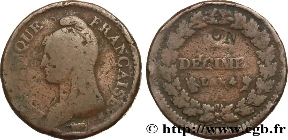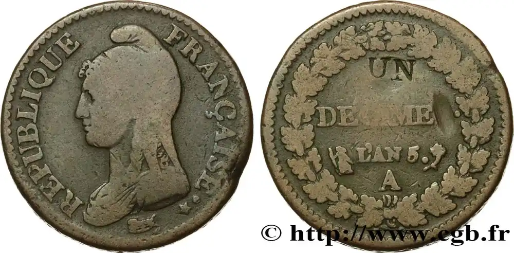 Type : Un décime Dupré, modification du 2 décimesDate : An 5 (1796-1797)Nom de l’atelier/ville : ParisQuantité frappée : —Métal : cuivreDiamètre : 31 mmAxe des coins : 6 h.Poids : 19,55 g.Tranche : macléeDegré de rareté : R1Référence ouvrage :Classement FRANC 2023 / FRANC 2023 classificationF.127/5AversTitulature avers : REPUBLIQUE FRANÇAISE..Description avers : Tête de la République aux cheveux longs à gauche, drapée et coiffée d’un bonnet phrygien (Mesdames Tallien ou Récamier); au-dessous Dupré* en cursif.ReversTitulature revers : UN (POINÇONNÉ EN CREUX) / DÉCIME (ESPACE POUR LE S ARASÉ)..Description revers : En deux lignes dans le champ, au-dessus de L’AN 5 suivi d’un point et de la lettre d’atelier A encadrés des différents, dans une couronne fermée composée de deux branches de chêne opposées nouées à leur base par un ruban.HistoriqueDIRECTOIRE(26/10/1795-9-10/11/1799) Lors de la séparation de la Convention, le 25 octobre 1795, un nouveau pouvoir exécutif prévu par la constitution thermidorienne se met en place. Cette constitution prévoit de confier le pouvoir à un directoire de cinq membres dont chacun préside à tour de rôle avec remplacement d’un membre tous les deux ans. Ce directoire nomme les ministres et les fonctionnaires, dirige la politique étrangère et fait exécuter les lois mais il ne les élabore pas et n’a aucun contrôle des deniers publics. Le pouvoir est partagé avec deux chambres : le Conseil des Cinq-Cents et le Conseil des Anciens qui forment le Corps législatif. Ce pouvoir est résolu à se maintenir face au risque d’une restauration monarchique ou d’une réaction jacobine mais il est surtout paralysé par la crise financière et doit renoncer à l’assignat en 1796. Le remplacement des assignats par les mandats territoriaux n’inspire pas plus de confiance et cette nouvelle monnaie fiduciaire est supprimée en 1797. Face à la misère et aux tentatives de déstabilisation, le Directoire, accusé d’être une « république bourgeoise », revient aux mesures révolutionnaires et policières. Par ailleurs, depuis 1792, la guerre est ininterrompue et l’influence des chefs militaires est croissante. En 1799, les partisans d’un pouvoir fort, dont Sieyès, se retrouvent au Directoire et ils ouvrent la voie du pouvoir à Bonaparte, de retour d’Égypte. Le coup d’État des 18 et 19 brumaire an VIII permet l’instauration d’une dictature militaire sous le nom de Consulat.