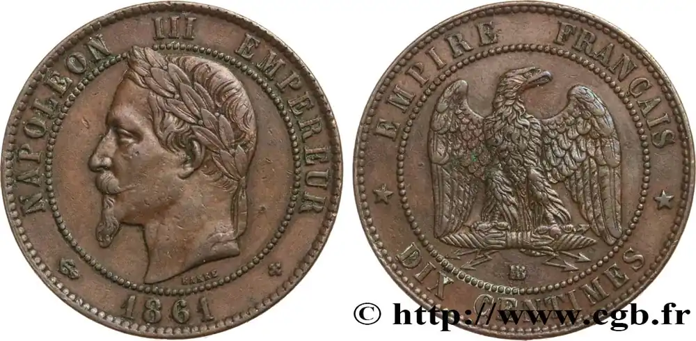 Type : Dix centimes Napoléon III, tête lauréeDate : 1862Nom de l’atelier/ville : ParisQuantité frappée : 5463211Métal : bronzeDiamètre : 30 mmAxe des coins : 6 h.Poids : 9,58 g.Tranche : lisseRéférence ouvrage :Classement FRANC 2023 / FRANC 2023 classificationF.134/7AversTitulature avers : NAPOLEON III EMPEREUR// (ANCRE) 1862 (MM).Description avers : Tête laurée de Napoléon III à gauche ; signé BARRE au-dessous.ReversTitulature revers : EMPIRE FRANÇAIS// * DIX CENTIMES *.Description revers : Aigle debout sur un foudre, les ailes ouvertes, la tête tournée à droite ; au-dessous A.HistoriqueSECOND EMPIRE(02/12/1852-04/09/1870) Proclamé empereur sous le nom de Napoléon III, Louis Napoléon fait son entrée solennelle à Paris le 2 décembre 1852. Il épouse Eugénie Marie de Montijo, aristocrate espagnole, en janvier 1853. Son règne peut se diviser en trois périodes : l’Empire autoritaire jusqu’en 1860 ; l’Empire libéral de 1860 à 1870 puis l’Empire parlementaire en 1870. Durant l’Empire autoritaire, Napoléon III exerce son pouvoir sans partage, contrôle la presse tandis que les journaux pratiquent l’autocensure pour éviter leur suppression. Les préfets exercent une puissance illimitée dans les départements, les maires, les fonctionnaires sont nommés par le gouvernement. Comme sous le Premier Empire, l’Éducation et l’Université sont surveillées. Maintenant les grands principes de la révolution, la souveraineté du peuple est continuée grâce à la consultation par plébiscite. Sur le plan économique, l’essor est important, l’industrialisation se développe ainsi que les organismes de crédit et les grands magasins. Le prestige militaire est accru par la guerre de Crimée qui permet à la France de jouer un rôle international. L’attentat d’Orsini (janvier 1858) n’empêche nullement la France d’intervenir en Italie pour faire triompher le principe des nationalités et permet le rattachement de Nice et de la Savoie par le traité de Turin (mars 1860). Dès 1860, l’Empire évolue vers plus de libertés : traité libre-échangiste de commerce avec l’Angleterre, apparition d’une faible opposition dans le Corps législatif, octroi du droit de grève (1864), libéralisation de la presse (1868). Sur le plan international, la France acquiert la Nouvelle-Calédonie, la Cochinchine et encourage le creusement du canal de Suez par Ferdinand de Lesseps. Au Mexique, le soutien à Maximilien et à l’Autriche est toutefois un échec. Les élections de 1869 sont très mauvaises pour le régime et l’opposition obtient 45 % des voix. Le régime évolue alors vers un Empire parlementaire en appelant Émile Ollivier, chef du parti orléaniste et libéral, au pouvoir. Après Sadowa en 1866 où la Prusse écrase l’Autriche, l’affaire du trône d’Espagne et de la dépêche d’Ems entraînent la guerre qui est déclarée le 19 juillet 1870. Accumulant les revers, l’armée française est encerclée dans Metz puis Napoléon III, malade, capitule à Sedan le 2 septembre. Aussitôt la nouvelle connue, la déchéance de l’Empire est annoncée par Gambetta puis la République est proclamée le 4 septembre. Napoléon III est alors emmené en captivité en Hesse puis part dans le Kent où il meurt en 1873.