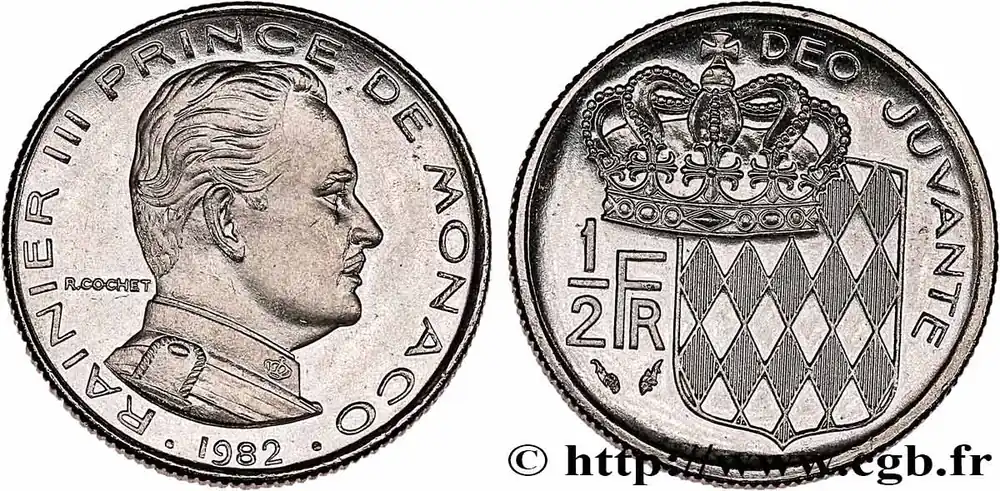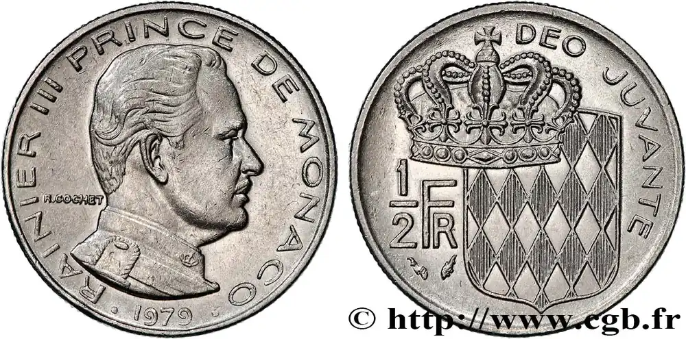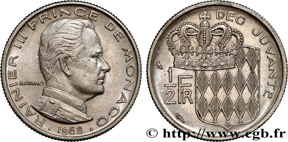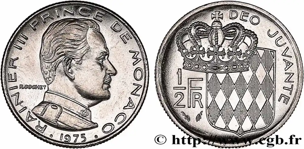 Type : 1/2 Franc Rainier IIIDate : 1976Nom de l’atelier/ville : ParisQuantité frappée : 62500Métal : nickelDiamètre : 19,5 mmAxe des coins : 6 h.Poids : 4,50 g.Tranche : striéeRéférence ouvrage :G.2019.149 – KM20/145 AversTitulature avers : RAINIER III PRINCE DE MONACO . (DATE) ..Description avers : Tête de Rainier III à droite.ReversTitulature revers : DEO JUVANTE / 1/2 FR.Description revers : Couronne princière devant le blason des Grimaldi.HistoriqueMONACO