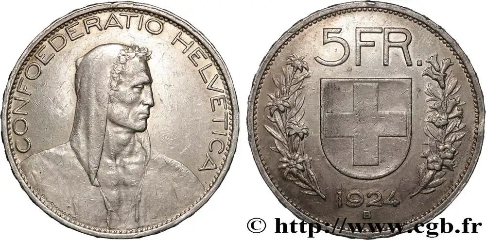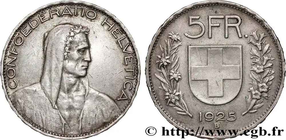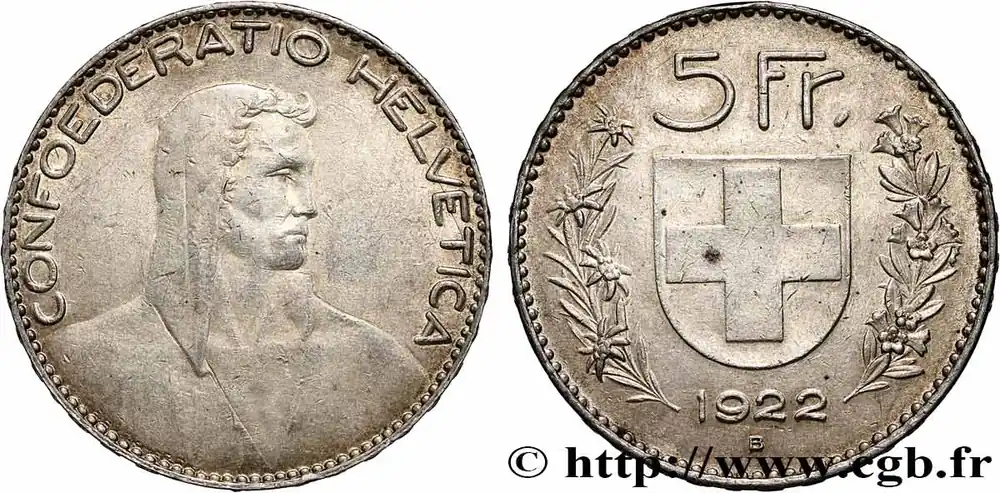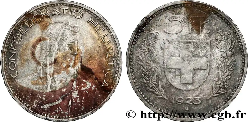 Type : 5 Francs BergerDate : 1923Nom de l’atelier/ville : BerneQuantité frappée : 11300000Métal : argentTitre en millième : 900 ‰Diamètre : 37 mmAxe des coins : 6 h.Poids : 24,93 g.Tranche : tranche en reliefCommentaires sur l’état de conservation :Monnaie nettoyéeRéférence ouvrage :KM20/37  – HMZ.1199 AversTitulature avers : CONFOEDERATIO HELVETICA.Description avers : Buste drapé à droite.Traduction avers : (Confédération helvétique).ReversTitulature revers : 5 FR./ 1923/ B.Description revers : Écu dans une couronne.HistoriqueSUISSE
