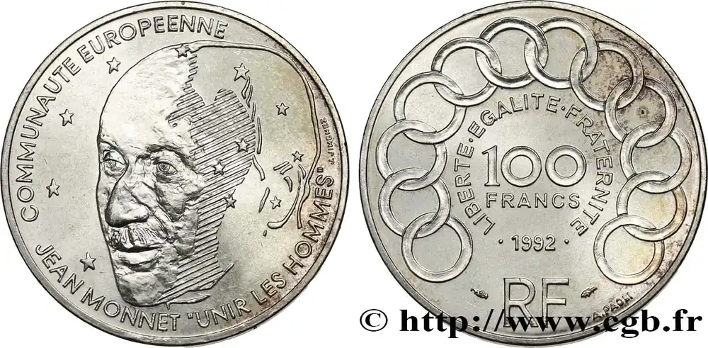 Type : 100 francs Panthéon, BE (Belle Épreuve)Date : 1991Quantité frappée : 6.232Métal : argentTitre en millième : 900 ‰Diamètre : 31 mmAxe des coins : 6 h.Poids : 15 g.Tranche : lisseRéférence ouvrage :Classement FRANC 2023 / FRANC 2023 classificationF.451/12AversTitulature avers : RÉPUBLIQUE FRANÇAISE / (MILLÉSIME ENCADRÉ DES DIFFÉRENTS).Description avers : La façade du Panthéon posée sur la phrase de son fronton : AUX GRANDS HOMMES / LA PATRIE RECONNAISSANTE.ReversTitulature revers : LIBERTÉ . ÉGALITÉ . FRATERNITÉ / 100 F.Description revers : Dans un hexagone, un arbre enraciné, chêne à gauche, olivier à droite, signé dans les racines à droite de la rosette de l’Atelier de Gravure.CommentaireExemplaire sous capsule issu d’une série Belle Épreuve.HistoriqueCINQUIÈME RÉPUBLIQUE(depuis le 08/01/1959) La Cinquième République, dont la constitution a été approuvée par référendum le 28 septembre 1958 par plus de 79 % des Français, ne débute officiellement qu’avec l’installation du général de Gaulle comme président le 8 janvier 1959. La constitution est modifiée le 28 octobre 1962 par référendum où une majorité de 62 % des voix approuve l’élection du président de la République au suffrage universel direct. Les différents présidents de la Ve République sont Charles de Gaulle (8/01/1959 – 27/04/1969, retrait et Alain Poher devient président par intérim), Georges Pompidou (15/06/1969 – 2/04/1974, décédé, Alain Poher devient président par intérim), Valéry Giscard d’Estaing (19/05/1974 – 21/05/1981), François Mitterrand (21/05/1981 – 7/05/1995), Jacques Chirac (7/05/1995 – 16/05/2007) , Nicolas Sarkozy (16/05/2007 – 15/05/2012), François Hollande (15/05/2012 – 14/05/2017) et Emmanuel Macron (14/05/2017 – ).