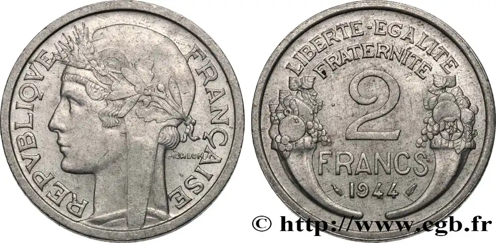 Type : 2 francs Morlon, aluminiumDate : 1945Nom de l’atelier/ville : Beaumont-Le-RogerQuantité frappée : 1.726.144Métal : aluminiumDiamètre : 27 mmAxe des coins : 6 h.Poids : 2,2 g.Tranche : lisseCommentaires sur l’état de conservation :Monnaie nettoyéeRéférence ouvrage :Classement FRANC 2023 / FRANC 2023 classificationF.269/6AversTitulature avers : REPVBLIQVE FRANÇAISE.Description avers : buste drapé de la République aux cheveux courts à gauche, coiffée d’un bonnet phrygien orné d’une cocarde tricolore (centre guilloché, cercle lisse, cercle guilloché), sous une couronne composite de blé, chêne et olivier nouée par un ruban ; sous le ruban MORLON.ReversTitulature revers : LIBERTE – EGALITE / FRATERNITE.Description revers : 2 / FRANCS, en deux lignes au-dessus du millésime encadré des différents, le tout entre deux cornes d’abondance symétriquement opposées.HistoriqueGOUVERNEMENT PROVISOIRE DE LA RÉPUBLIQUE FRANÇAISE(26/08/1944-16/01/1947) Le Gouvernement Provisoire de la République Française (G.P.R.F.) est le nom donné au Comité Français de Libération Nationale (C.F.L.N.) dirigé par le général de Gaulle depuis juin 1944 et en prévision du débarquement allié. Reconnu par les États-Unis, peu à peu, le Gouvernement Provisoire de la République Française voit son autorité s’étendre aux régions libérées. Ce gouvernement est installé à Paris le 31 août 1944 et est remanié en septembre pour permettre l’entrée de personnalités issues de la résistance intérieure. Ce gouvernement reste en fonction jusqu’au 16 janvier 1947, date de l’élection de Vincent Auriol à la présidence de la Quatrième République. À sa tête se succédent le général de Gaulle, Félix Gouin, Georges Bidault et Léon Blum.