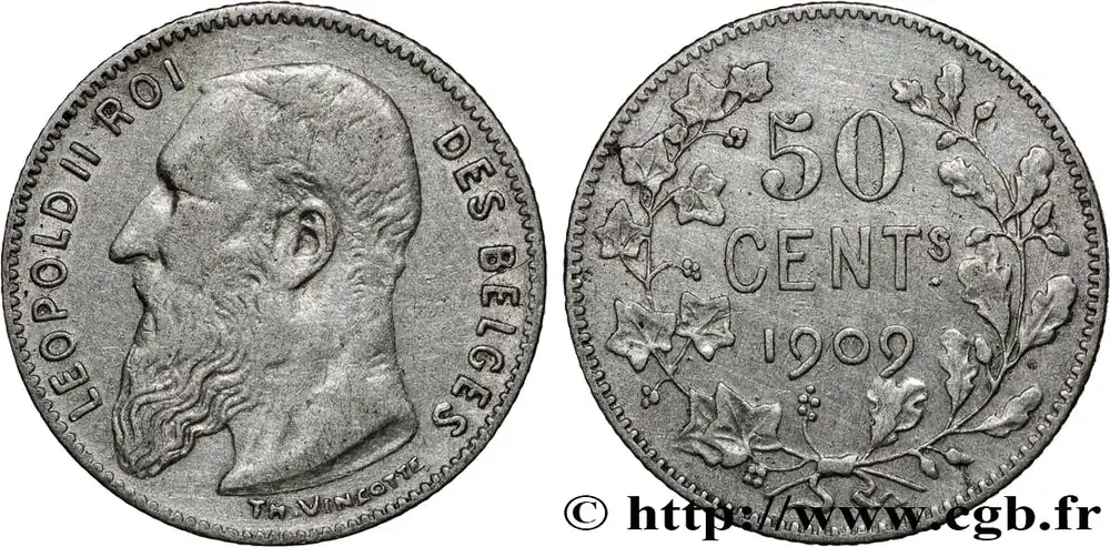 Type : 50 Centimes Léopold II légende en françaisDate : 1909Quantité frappée : 2502916Métal : argentTitre en millième : 835 ‰Diamètre : 18 mmAxe des coins : 6 h.Poids : 2,44 g.Tranche : canneléeRéférence ouvrage :KM20/60.1 AversTitulature avers : LEOPOLD II – ROI DES BELGES // TH. VINÇOTTE.Description avers : portrait à gauche du roi Léopold II.ReversTitulature revers : 50 / CENTS / 1909.Description revers : dans le champ entre un rameau de lierre à gauche et un rameau de chêne à droite.HistoriqueBELGIQUE