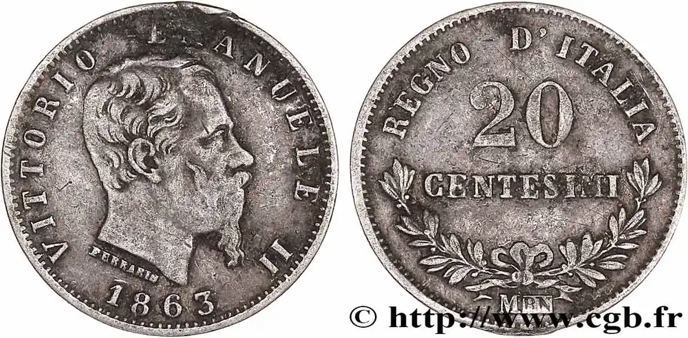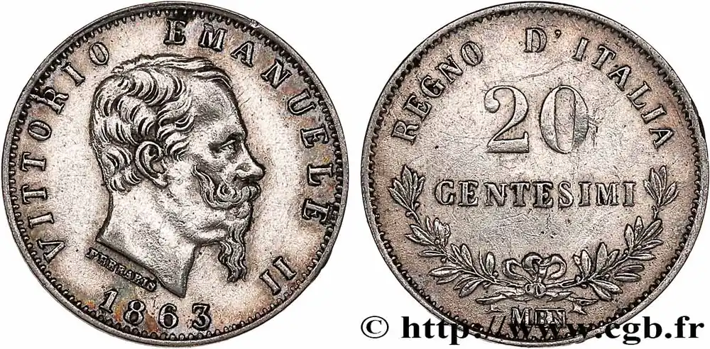 Type : 20 Centesimi Victor Emmanuel IIDate : 1863Nom de l’atelier/ville : MilanQuantité frappée : 27844963Métal : argentTitre en millième : 835 ‰Diamètre : 16 mmAxe des coins : 6 h.Poids : 0,91 g.Tranche : lisseCommentaires sur l’état de conservation :Monnaie nettoyéeRéférence ouvrage :Mont.226 – KM19/13.1 AversTitulature avers : VITTORIO EMANUELE II // 1863.Description avers : Tête nue à droite de Victor Emmanuel II.ReversTitulature revers : REGNO D’ITALIA // 20 CENTESIMI.Description revers : dans la champ, couronne de laurier.HistoriqueITALIE