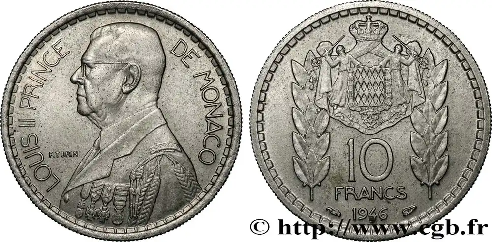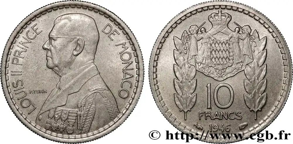 Type : 10 Francs Louis IIDate : 1946Nom de l’atelier/ville : ParisQuantité frappée : 1000000Métal : cupro-nickelDiamètre : 26 mmAxe des coins : 6 h.Poids : 6,94 g.Tranche : striéeRéférence ouvrage :G.2019.136  – KM20/123 AversTitulature avers : LOUIS II PRINCE – DE MONACO.Description avers : Buste à gauche en grand uniforme.ReversTitulature revers : 10 / FRANCS / 1946.Description revers : Armoiries de Monaco entourée de deux branches de laurier.HistoriqueMONACO
