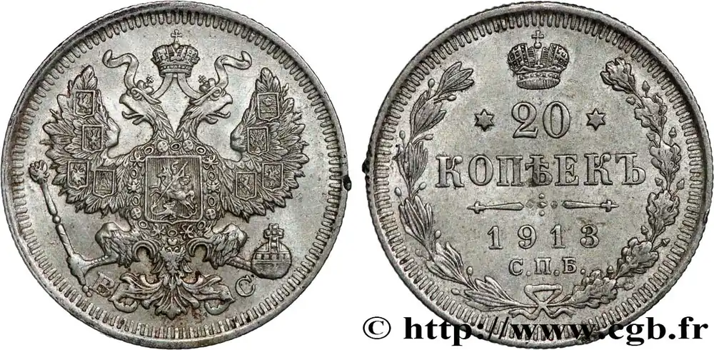 Type : 20 Kopecks aigle bicéphaleDate : 1910Nom de l’atelier/ville : Saint-PetersbourgQuantité frappée : 11000000Métal : argentTitre en millième : 500 ‰Diamètre : 20 mmAxe des coins : 12 h.Poids : 3,71 g.Tranche : striéeCommentaires sur l’état de conservation :Traces de nettoyageRéférence ouvrage :KM20/22a.2 AversTitulature avers : (LÉGENDE CYRILLIQUE) BC.Description avers : Aigle bicéphale héraldique couronné.ReversTitulature revers : (LÉGENDE CYRILLIQUE) * 20 * / КОПѢЕКЪ / 1910 / С.П.Б..Description revers : Légende dans une couronne ouverte.Traduction revers : (20 Kopecks).CommentaireNicolas II (18/051868-16/07/1918), le fils aîné d’Alexandre III et de Marie, succède à son père en 1894. Marié à Alix de Hesse dont il a cinq enfants, quatre filles et un garçon, il est un autocrate résigné. Dominé par Raspoutine jusqu’à l’assassinat de celui-ci en 1916, il s’est laissé entraîner dans la guerre russo-japonaise qui lui enlève la Mandchourie. La révolution de 1905 a fait vaciller son trône et la création d’une Douma démocratiquement élue ne peut pas empêcher la constitution de groupuscules bolcheviques, déterminés à prendre le pouvoir par la force. Il se laisse entraîner dans la guerre de 1914 par le jeu des alliances et son trône n’y résiste pas. Il est renversé en 1917 par la révolution de février et assassiné l’année suivante avec toute sa famille.HistoriqueRUSSIE