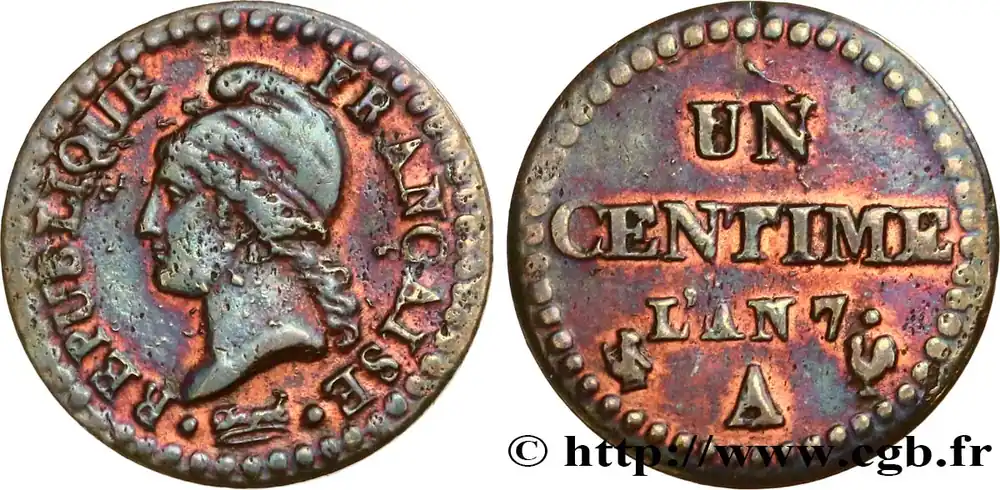 Type : Un centime Dupré, 7 normalDate : An 7 (1798-1799)Nom de l’atelier/ville : ParisQuantité frappée : —Métal : cuivreDiamètre : 18 mmAxe des coins : 6 h.Poids : 1,69 g.Tranche : lisseCommentaires sur l’état de conservation :Exemplaire présentantdes concrétions vertes au droitRéférence ouvrage :Classement FRANC 2023 / FRANC 2023 classificationF.100/15AversTitulature avers : REPUBLIQUE FRANÇAISE.Description avers : Tête de la République aux cheveux longs à gauche, coiffée d’un bonnet phrygien ; au-dessous Dupré en cursif encadré de points ; grènetis circulaire formé de points.ReversTitulature revers : UN / CENTIME.Description revers : Légende en deux lignes dans le champ, au-dessus de L’AN 7, suivi d’un point, la lettre d’atelier A sous le millésime ; grènetis circulaire formé de points.CommentaireIl existe, pour les centimes de l’an 7, trois tailles différentes de millésime : grand 7, 7 normal et petit 7.7 normal. Exemplaire avec 53 perles au droit et 50 perles au revers.Autant l’on retrouve facilement des centimes de la Deuxième République en états supérieurs, autant ceux de la Première sont introuvables avec le rouge d’origine correctement préservé. L’explication est simple : entre l’An 8 (1799) et 1848, il n’y a pas de frappe de centimes. Ceux de la Première République ont donc circulé un demi siècle sans concurrence.HistoriqueDIRECTOIRE(26/10/1795-9-10/11/1799) Lors de la séparation de la Convention, le 25 octobre 1795, un nouveau pouvoir exécutif prévu par la constitution thermidorienne se met en place. Cette constitution prévoit de confier le pouvoir à un directoire de cinq membres dont chacun préside à tour de rôle avec remplacement d’un membre tous les deux ans. Ce directoire nomme les ministres et les fonctionnaires, dirige la politique étrangère et fait exécuter les lois mais il ne les élabore pas et n’a aucun contrôle des deniers publics. Le pouvoir est partagé avec deux chambres : le Conseil des Cinq-Cents et le Conseil des Anciens qui forment le Corps législatif. Ce pouvoir est résolu à se maintenir face au risque d’une restauration monarchique ou d’une réaction jacobine mais il est surtout paralysé par la crise financière et doit renoncer à l’assignat en 1796. Le remplacement des assignats par les mandats territoriaux n’inspire pas plus de confiance et cette nouvelle monnaie fiduciaire est supprimée en 1797. Face à la misère et aux tentatives de déstabilisation, le Directoire, accusé d’être une « république bourgeoise », revient aux mesures révolutionnaires et policières. Par ailleurs, depuis 1792, la guerre est ininterrompue et l’influence des chefs militaires est croissante. En 1799, les partisans d’un pouvoir fort, dont Sieyès, se retrouvent au Directoire et ils ouvrent la voie du pouvoir à Bonaparte, de retour d’Égypte. Le coup d’État des 18 et 19 brumaire an VIII permet l’instauration d’une dictature militaire sous le nom de Consulat.