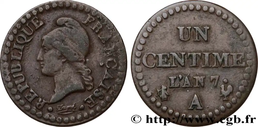 Type : Un centime Dupré, 7 normalDate : An 7 (1798-1799)Nom de l’atelier/ville : ParisQuantité frappée : —Métal : cuivreDiamètre : 18 mmAxe des coins : 6 h.Poids : 2,11 g.Tranche : lisseCommentaires sur l’état de conservation :Exemplaire nettoyéRéférence ouvrage :Classement FRANC 2023 / FRANC 2023 classificationF.100/15AversTitulature avers : REPUBLIQUE FRANÇAISE.Description avers : Tête de la République aux cheveux longs à gauche, coiffée d’un bonnet phrygien ; au-dessous Dupré en cursif encadré de points ; grènetis circulaire formé de points.ReversTitulature revers : UN / CENTIME.Description revers : Légende en deux lignes dans le champ, au-dessus de L’AN 7, suivi d’un point, la lettre d’atelier A sous le millésime ; grènetis circulaire formé de points.CommentaireIl existe, pour les centimes de l’an 7, trois tailles différentes de millésime : grand 7, 7 normal et petit 7. 7 normal. Exemplaire avec 53 perles au droit et 50 perles au revers. Axe à 7h.HistoriqueDIRECTOIRE(26/10/1795-9-10/11/1799) Lors de la séparation de la Convention, le 25 octobre 1795, un nouveau pouvoir exécutif prévu par la constitution thermidorienne se met en place. Cette constitution prévoit de confier le pouvoir à un directoire de cinq membres dont chacun préside à tour de rôle avec remplacement d’un membre tous les deux ans. Ce directoire nomme les ministres et les fonctionnaires, dirige la politique étrangère et fait exécuter les lois mais il ne les élabore pas et n’a aucun contrôle des deniers publics. Le pouvoir est partagé avec deux chambres : le Conseil des Cinq-Cents et le Conseil des Anciens qui forment le Corps législatif. Ce pouvoir est résolu à se maintenir face au risque d’une restauration monarchique ou d’une réaction jacobine mais il est surtout paralysé par la crise financière et doit renoncer à l’assignat en 1796. Le remplacement des assignats par les mandats territoriaux n’inspire pas plus de confiance et cette nouvelle monnaie fiduciaire est supprimée en 1797. Face à la misère et aux tentatives de déstabilisation, le Directoire, accusé d’être une « république bourgeoise », revient aux mesures révolutionnaires et policières. Par ailleurs, depuis 1792, la guerre est ininterrompue et l’influence des chefs militaires est croissante. En 1799, les partisans d’un pouvoir fort, dont Sieyès, se retrouvent au Directoire et ils ouvrent la voie du pouvoir à Bonaparte, de retour d’Égypte. Le coup d’État des 18 et 19 brumaire an VIII permet l’instauration d’une dictature militaire sous le nom de Consulat.