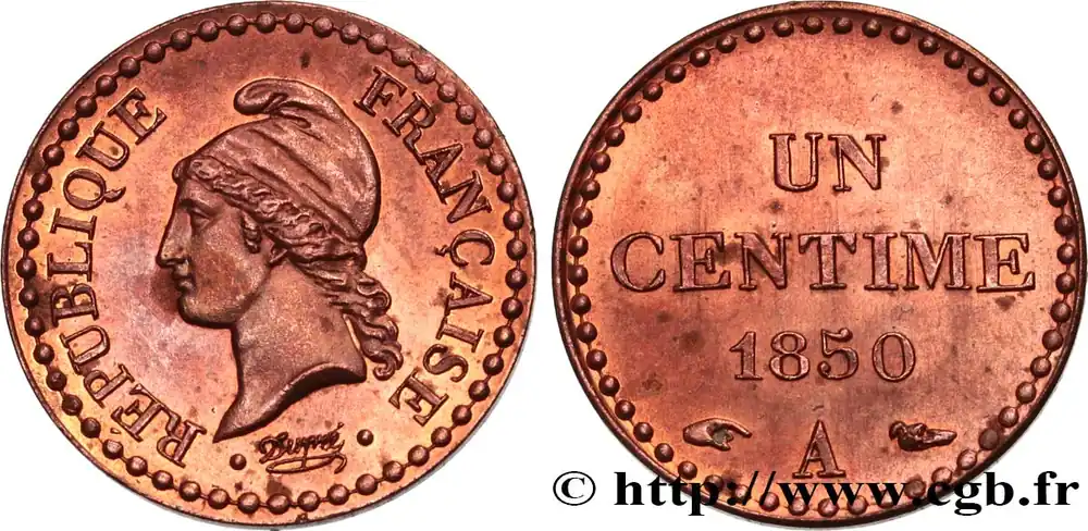 Type : Un centime Dupré, IIe RépubliqueDate : 1850Nom de l’atelier/ville : ParisQuantité frappée : 2720626Métal : bronzeDiamètre : 18 mmAxe des coins : 6 h.Poids : 1,95g.Tranche : lisseRéférence ouvrage :Classement FRANC 2023 / FRANC 2023 classificationF.101/5AversTitulature avers : RÉPUBLIQUE FRANÇAISE.Description avers : Tête de la République aux cheveux longs à gauche, coiffée d’un bonnet phrygien ; au-dessous Dupré en cursif encadré de points ; grènetis circulaire formé de points.ReversTitulature revers : UN / CENTIME.Description revers : Légende en deux lignes dans le champ, au-dessus de 1850 et de la lettre d’atelier A, encadrée des différents ; grènetis circulaire formé de points.CommentaireExemplaire avec accent sur le E de RÉPUBLIQUE.HistoriqueDEUXIÈME RÉPUBLIQUE(24/02/1848-2/12/1852) Lors de la révolution de février 1848, Louis-Philippe abdique en faveur de son petit-fils mais celui-ci n’est pas reconnu par les Chambres et, le 24 février, la République est proclamée par un décret du gouvernement provisoire. Celui-ci a proclamé la liberté du travail, la suppression de la peine de mort en matière politique, le suffrage universel. Les ateliers nationaux sont créés en mars 1848. Des élections ont lieu dès avril et aboutissent au succès des républicains modérés. La fermeture des ateliers nationaux provoque des émeutes qui sont réprimées dans le sang par le général Cavaignac qui est nommé président du conseil. Les révoltés sont exécutés, emprisonnés, déportés. Le pouvoir législatif est confié à une assemblée unique alors que le président de la République, élu au suffrage universel, détient l’exécutif. Ce dernier est le prince Louis Napoléon. Il entre en conflit avec l’assemblée dès 1850 car sa réélection est anticonstitutionnelle. Louis Napoléon s’engage alors dans la préparation du coup d’État qui lui permet, le 2 décembre 1851, d’installer sa dictature. En novembre 1852, il est proposé de rétablir la dignité impériale héréditaire. Le plébiscite des 21-22 novembre donne près de huit millions de oui pour l’Empire tandis que le non ne recueillait qu’environ 250.000 voix. Le 2 décembre 1852, Louis Napoléon est proclamé empereur sous le nom de Napoléon III.