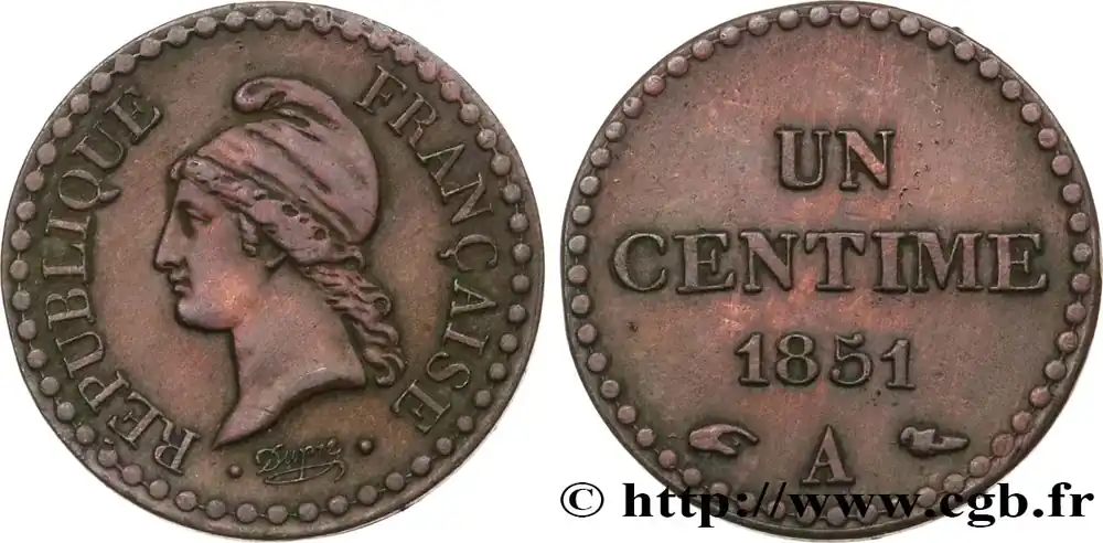 Type : Un centime Dupré, IIe RépubliqueDate : 1851Nom de l’atelier/ville : ParisQuantité frappée : —Métal : bronzeDiamètre : 18 mmAxe des coins : 6 h.Poids : 2,01 g.Tranche : lisseRéférence ouvrage :Classement FRANC 2023 / FRANC 2023 classificationF.101/8AversTitulature avers : RÉPUBLIQUE FRANÇAISE.Description avers : Tête de la République aux cheveux longs à gauche, coiffée d’un bonnet phrygien ; au-dessous Dupré en cursif encadré de points ; grènetis circulaire formé de points.ReversTitulature revers : UN / CENTIME.Description revers : Légende en deux lignes dans le champ, au-dessus de 1851 et de la lettre d’atelier A, encadrée des différents ; grènetis circulaire formé de points.CommentaireSans accent sur le E de RÉPUBLIQUE.HistoriqueDEUXIÈME RÉPUBLIQUE(24/02/1848-2/12/1852) Lors de la révolution de février 1848, Louis-Philippe abdique en faveur de son petit-fils mais celui-ci n’est pas reconnu par les Chambres et, le 24 février, la République est proclamée par un décret du gouvernement provisoire. Celui-ci a proclamé la liberté du travail, la suppression de la peine de mort en matière politique, le suffrage universel. Les ateliers nationaux sont créés en mars 1848. Des élections ont lieu dès avril et aboutissent au succès des républicains modérés. La fermeture des ateliers nationaux provoque des émeutes qui sont réprimées dans le sang par le général Cavaignac qui est nommé président du conseil. Les révoltés sont exécutés, emprisonnés, déportés. Le pouvoir législatif est confié à une assemblée unique alors que le président de la République, élu au suffrage universel, détient l’exécutif. Ce dernier est le prince Louis Napoléon. Il entre en conflit avec l’assemblée dès 1850 car sa réélection est anticonstitutionnelle. Louis Napoléon s’engage alors dans la préparation du coup d’État qui lui permet, le 2 décembre 1851, d’installer sa dictature. En novembre 1852, il est proposé de rétablir la dignité impériale héréditaire. Le plébiscite des 21-22 novembre donne près de huit millions de oui pour l’Empire tandis que le non ne recueillait qu’environ 250.000 voix. Le 2 décembre 1852, Louis Napoléon est proclamé empereur sous le nom de Napoléon III.