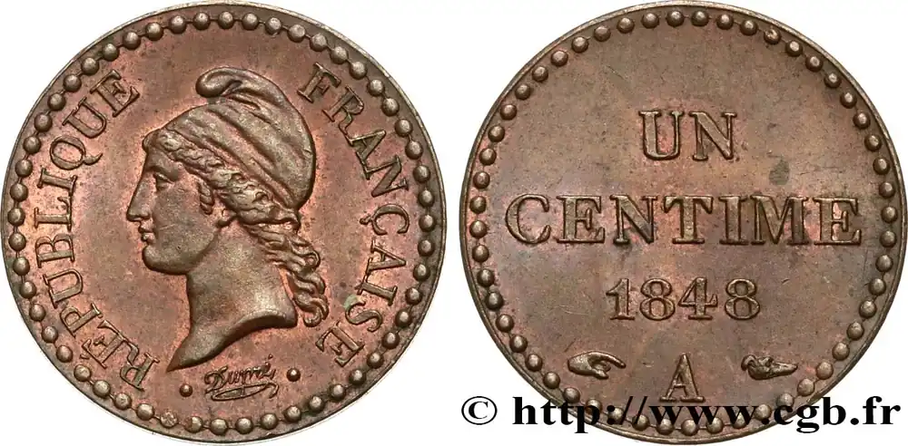 Type : Un centime Dupré, IIe République, nickeléeDate : 1851Nom de l’atelier/ville : ParisQuantité frappée : —Métal : bronze-nickelDiamètre : 18 mmAxe des coins : 6 h.Poids : 2 g.Tranche : lisseRéférence ouvrage :Classement FRANC 2023 / FRANC 2023 classificationF.101/8Pedigree :Cet exemplaire provient de la Collection Bruno MiquelAversTitulature avers : RÉPUBLIQUE FRANÇAISE.Description avers : Tête de la République aux cheveux longs à gauche, coiffée d’un bonnet phrygien ; au-dessous Dupré en cursif encadré de points ; grènetis circulaire formé de points.ReversTitulature revers : UN / CENTIME.Description revers : Légende en deux lignes dans le champ, au-dessus de 1851 et de la lettre d’atelier A, encadrée des différents ; grènetis circulaire formé de points.CommentaireSans accent sur le E de RÉPUBLIQUE.Exemplaire nickelé.HistoriqueDEUXIÈME RÉPUBLIQUE(24/02/1848-2/12/1852) Lors de la révolution de février 1848, Louis-Philippe abdique en faveur de son petit-fils mais celui-ci n’est pas reconnu par les Chambres et, le 24 février, la République est proclamée par un décret du gouvernement provisoire. Celui-ci a proclamé la liberté du travail, la suppression de la peine de mort en matière politique, le suffrage universel. Les ateliers nationaux sont créés en mars 1848. Des élections ont lieu dès avril et aboutissent au succès des républicains modérés. La fermeture des ateliers nationaux provoque des émeutes qui sont réprimées dans le sang par le général Cavaignac qui est nommé président du conseil. Les révoltés sont exécutés, emprisonnés, déportés. Le pouvoir législatif est confié à une assemblée unique alors que le président de la République, élu au suffrage universel, détient l’exécutif. Ce dernier est le prince Louis Napoléon. Il entre en conflit avec l’assemblée dès 1850 car sa réélection est anticonstitutionnelle. Louis Napoléon s’engage alors dans la préparation du coup d’État qui lui permet, le 2 décembre 1851, d’installer sa dictature. En novembre 1852, il est proposé de rétablir la dignité impériale héréditaire. Le plébiscite des 21-22 novembre donne près de huit millions de oui pour l’Empire tandis que le non ne recueillait qu’environ 250.000 voix. Le 2 décembre 1852, Louis Napoléon est proclamé empereur sous le nom de Napoléon III.