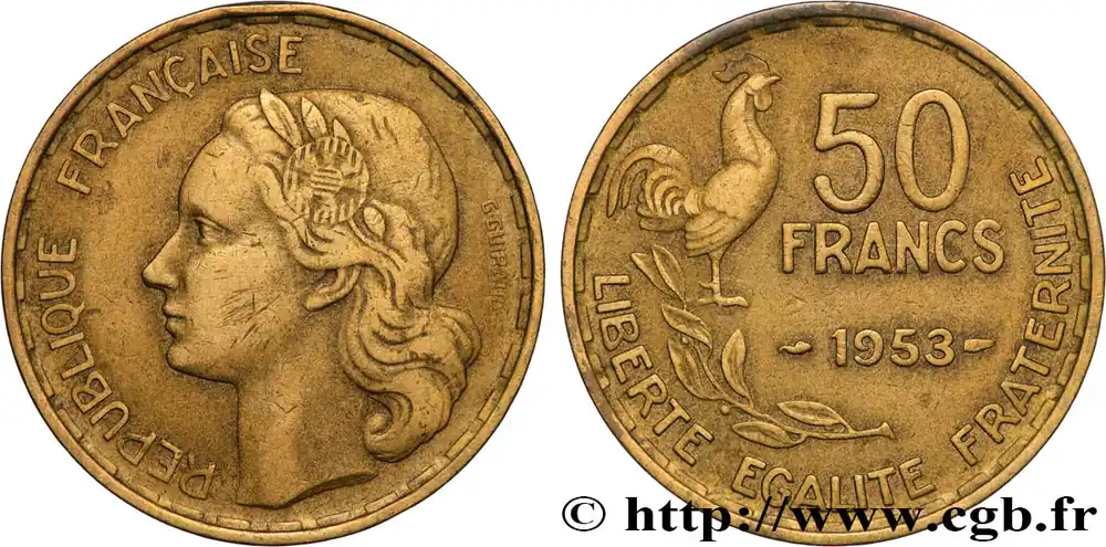 Type : 50 francs GuiraudDate : 1954Quantité frappée : 1083200Métal : bronze-aluminiumDiamètre : 27 mmAxe des coins : 6 h.Poids : 7,97 g.Tranche : lisseCommentaires sur l’état de conservation :Exemplaire nettoyéRéférence ouvrage :Classement FRANC 2023 / FRANC 2023 classificationF.425/12AversTitulature avers : REPUBLIQUE FRANÇAISE.Description avers : Tête de Marianne aux cheveux courts à gauche, couronnée d’une branche d’olivier portant fruit, ornée d’une cocarde tricolore (centre guilloché horizontalement, cercle ondulé, cercle guilloché verticalement), ; signé G. GUIRAUD derrière la tête, le long du listel.ReversTitulature revers : LIBERTE EGALITE FRATERNITE.Description revers : 50 / FRANCS / 1954, entouré des différents ; coq debout à droite au-dessus d’une branche de laurier à gauche.HistoriqueQUATRIÈME RÉPUBLIQUE(16/01/1947-8/01/1959) Se caractérisant par un régime parlementaire doublé d’une grande instabilité ministérielle, la Quatrième République a pour particularité de n’avoir jamais été officiellement proclamée. En effet, De Gaulle, lors de son arrivée à Paris le 25 août 1944, refuse de le faire sous prétexte que la République n’avait jamais cessé d’exister. Considérant que l’État français du maréchal Pétain n’était qu’un simple état de fait, il estime que la République a survécu dans la France libre et son acte de naissance doit alors être le 18 juin 1940. Toutefois, son départ, le 20 janvier 1946, et le référendum du 13 octobre 1946 approuvant une nouvelle Constitution, marquent le début officiel de cette république. Elle connaît deux présidents : Vincent Auriol (16/01/1947 – 23/12/1953) et René Coty (23/12/1953 – 8/1/1959). La crise ouverte causée par la révolte de l’armée d’Algérie entraîne, en 1958, sa chute qui est confirmée par l’adoption d’une nouvelle constitution le 28 septembre 1958. Néanmoins, elle ne cesse définitivement d’être que le 8 janvier 1959 lors de l’installation du général de Gaulle comme président de la Ve République.