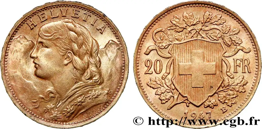 Type : 20 Francs or « Vreneli »Date : 1947Nom de l’atelier/ville : BerneQuantité frappée : 9200000Métal : orTitre en millième : 900 ‰Diamètre : 21 mmAxe des coins : 6 h.Poids : 6,45 g.Tranche : étoilée en reliefCommentaires sur l’état de conservation :Patine tachée, des rayuresRéférence ouvrage :KM20/35.2 – HMZ.2-1186 – F.499 – OC.7.28 AversTitulature avers : HELVETIA.Description avers : Buste de jeune fille à gauche devant un paysage montagneux ; au-dessous signature F. LANDRY.ReversTitulature revers : 20 – FR/ 1947 B.Description revers : Écu posé sur une branche de chêne.CommentaireCe type est frappé suite à la loi du 6 janvier 1896. La pièce est fabriquée entre 1896 et 1926 dans le cadre de l’Union Latine, puis jusqu’à 1935. Enfin des pièces furent encore frappées en 1947 et 1949 à titre boursier.HistoriqueOR, PALLADIUM ET PLATINE INVESTISSEMENTSécurisez et diversifiez votre épargne avec les métaux précieux :Dans un contexte d’instabilité politique et économique croissante, diversifier son épargne peut être une démarche judicieuse. Les métaux précieux comme l’or, le palladium et le platine constituent des actifs tangibles souvent prisés en raison de leur caractère intemporel et de leur résilience face aux fluctuations des marchés.Pour répondre à des besoins variés, l’achat de pièces officielles en or, palladium ou platine est une option flexible et adaptée. Ces pièces, disponibles à l’unité ou en lot, permettent à chacun d’ajuster ses choix selon ses objectifs et son budget, sans engagement à long terme.Un processus simple et sécurisé :Nous proposons une livraison sécurisée et garantie. Les paiements peuvent être effectués par carte bancaire ou par virement, bien que certaines transactions puissent nécessiter un règlement exclusivement par virement bancaire. Une pièce d’identité valide (carte nationale d’identité ou passeport) sera demandée pour finaliser votre achat.Stockage en toute sécurité et confidentialité :Le département Investissement de CGB Numismatique Paris met à votre disposition des solutions de stockage offrant une sécurité renforcée et une confidentialité optimale pour vos achats en or, palladium et platine.Contactez-nous pour plus d’informations :Pour toute question ou pour passer commande, prenez contact avec notre responsable des achats/ventes de métaux précieux : par email à [email protected] ou par téléphone. Nous mettons à votre disposition des informations générales et des services pour vous accompagner dans vos projets d’investissement.CGB Numismatique Paris agit en tant que fournisseur de métaux précieux et ne fournit aucun conseil en investissement. La valeur des métaux précieux peut fluctuer, et les performances passées ne garantissent pas les résultats futurs. L’achat de métaux précieux doit être considéré comme une stratégie de préservation de valeur plutôt qu’un investissement spéculatif. Conformément à l’article L.221-28 du Code de la consommation, le droit de rétractation ne s’applique pas aux achats d’or d’investissement, dont le prix dépend des fluctuations des marchés financiers.