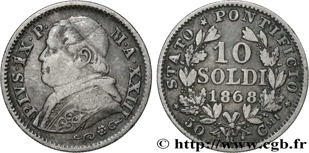 Type : 10 Soldi (50 Centesimi) Pie IX an XXIIIDate : 1868Nom de l’atelier/ville : RomeQuantité frappée : 3950000Métal : argentTitre en millième : 900 ‰Diamètre : 18,5 mmAxe des coins : 6 h.Poids : 2,39 g.Tranche : canneléeRéférence ouvrage :Mont.390  – KM19/1386.1 AversTitulature avers : PIVS. IX. P. – M.A.XXIII.Description avers : Buste du Saint-Père, Pie IX à gauche.ReversTitulature revers : * STATO * PONTIFICIO * / 50 – R – CMI.Description revers : Légende circulaire, au centre dans une couronne composite : 10/ SOLDI/ 1868.Traduction revers : (État Pontifical).HistoriqueVATICAN ET ÉTATS PONTIFICAUX