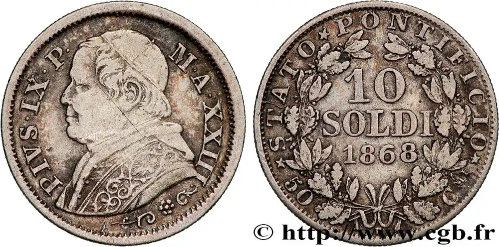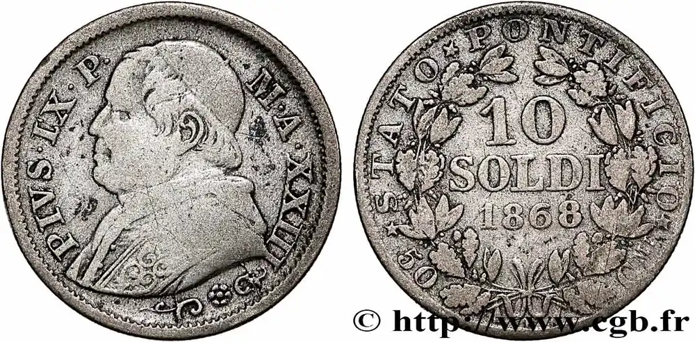 Type : 10 Soldi (50 Centesimi) Pie IX an XXIIIDate : 1868Nom de l’atelier/ville : RomeQuantité frappée : 3950000Métal : argentTitre en millième : 900 ‰Diamètre : 18,5 mmAxe des coins : 6 h.Poids : 3841 g.Tranche : canneléeRéférence ouvrage :Mont.390 – KM19/1386.1 AversTitulature avers : PIVS. IX. P. – M.A.XXIII.Description avers : Buste du Saint-Père, Pie IX à gauche.ReversTitulature revers : * STATO * PONTIFICIO * / 50 – R – CMI.Description revers : Légende circulaire, au centre dans une couronne composite : 10/ SOLDI/ 1868.Traduction revers : (État Pontifical).HistoriqueVATICAN ET ÉTATS PONTIFICAUX