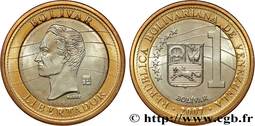 Type : 1 Bolivar Fuerte emblème, République Bolivarienne du Vénézuela / Simon BolivarDate : 2007Quantité frappée : -Métal : bimétalliqueDiamètre : 24 mmAxe des coins : 6 h.Poids : 8,05 g.Tranche : séries de canneluresRéférence ouvrage :KM21/- AversReversCommentaireLe Bolivar Fuerte (BsF) a été créé par la loi du 7 mars 2007. Sa mise en circulation est effective depuis le 1er Janvier 2008. L’équivalence est la suivante : 10 Bolivares = 1 Centimo (BsF) 1.000 Bolívares = 1 Bolivar Fuerte .HistoriqueVENEZUELA