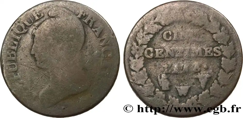 Type : Cinq centimes Dupré, grand moduleDate : An 5 (1796-1797)Nom de l’atelier/ville : LimogesQuantité frappée : 8436876Métal : cuivreDiamètre : 28 mmAxe des coins : 6 h.Poids : 9,29 g.Tranche : chevronnéeRéférence ouvrage :Classement FRANC 2023 / FRANC 2023 classificationF.115/23AversTitulature avers : .REPUBLIQUE – FRANÇAISE.*.Description avers : Buste drapé de la Liberté à gauche coiffée du bonnet phrygien (Mesdames Tallien ou Récamier) ; signé Dupré cursif au-dessous.ReversTitulature revers : CINQ / CENTIMES.Description revers : En deux lignes dans le champ, au-dessus L’AN 5 suivi d’un point et de la lettre d’atelier I encadrés des différents, dans une couronne fermée composée de deux branches de chêne opposées nouées à leur base par un ruban.HistoriqueDIRECTOIRE(26/10/1795-9-10/11/1799) Lors de la séparation de la Convention, le 25 octobre 1795, un nouveau pouvoir exécutif prévu par la constitution thermidorienne se met en place. Cette constitution prévoit de confier le pouvoir à un directoire de cinq membres dont chacun préside à tour de rôle avec remplacement d’un membre tous les deux ans. Ce directoire nomme les ministres et les fonctionnaires, dirige la politique étrangère et fait exécuter les lois mais il ne les élabore pas et n’a aucun contrôle des deniers publics. Le pouvoir est partagé avec deux chambres : le Conseil des Cinq-Cents et le Conseil des Anciens qui forment le Corps législatif. Ce pouvoir est résolu à se maintenir face au risque d’une restauration monarchique ou d’une réaction jacobine mais il est surtout paralysé par la crise financière et doit renoncer à l’assignat en 1796. Le remplacement des assignats par les mandats territoriaux n’inspire pas plus de confiance et cette nouvelle monnaie fiduciaire est supprimée en 1797. Face à la misère et aux tentatives de déstabilisation, le Directoire, accusé d’être une « république bourgeoise », revient aux mesures révolutionnaires et policières. Par ailleurs, depuis 1792, la guerre est ininterrompue et l’influence des chefs militaires est croissante. En 1799, les partisans d’un pouvoir fort, dont Sieyès, se retrouvent au Directoire et ils ouvrent la voie du pouvoir à Bonaparte, de retour d’Égypte. Le coup d’État des 18 et 19 brumaire an VIII permet l’instauration d’une dictature militaire sous le nom de Consulat.