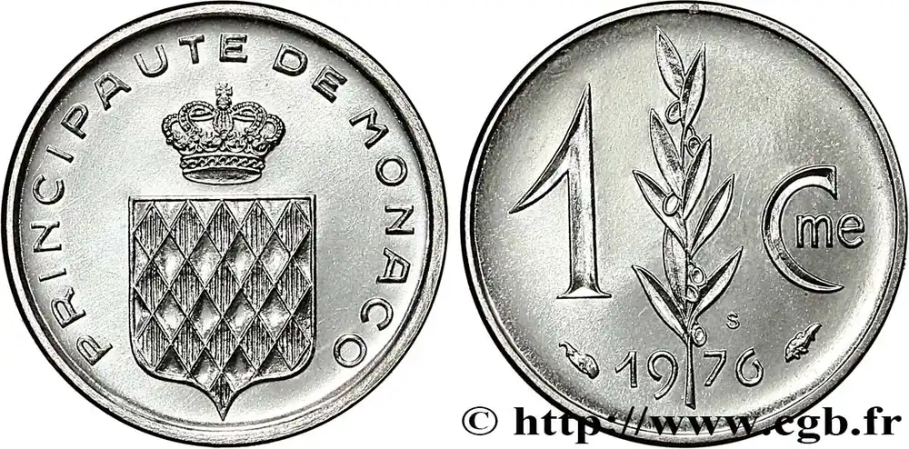 Type : 1 Centime écu couronnéDate : 1977Nom de l’atelier/ville : ParisQuantité frappée : 25000Métal : acierDiamètre : 15 mmAxe des coins : 6 h.Poids : 1,6 g.Tranche : lisseRéférence ouvrage :G.2019.144 – KM20/155 AversTitulature avers : PRINCIPAUTÉ DE MONACO.Description avers : Blason de Monaco couronné.ReversTitulature revers : 1 – CME / 1977.Description revers : Rameau d’olivier dressé.HistoriqueMONACO