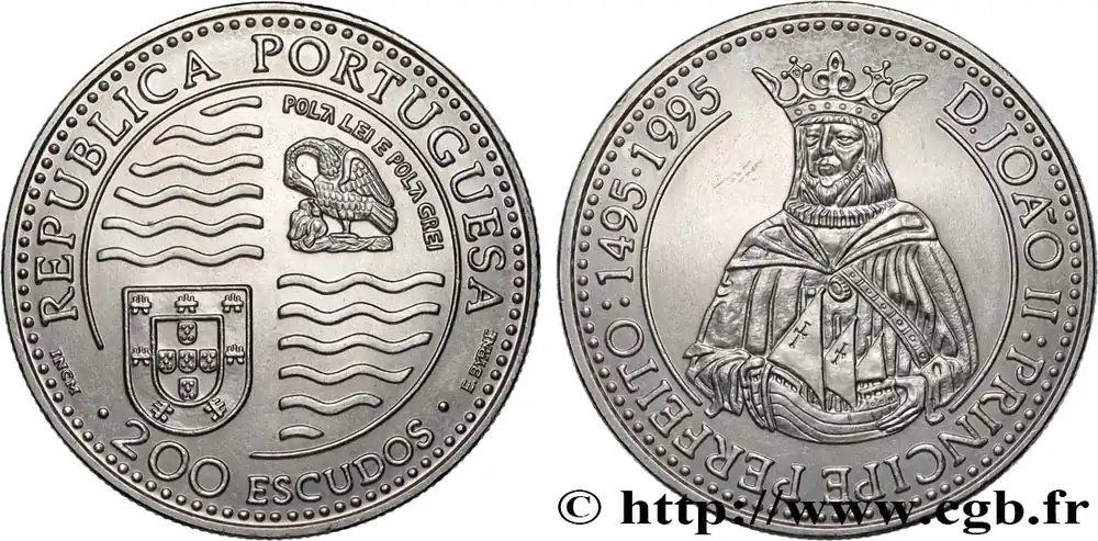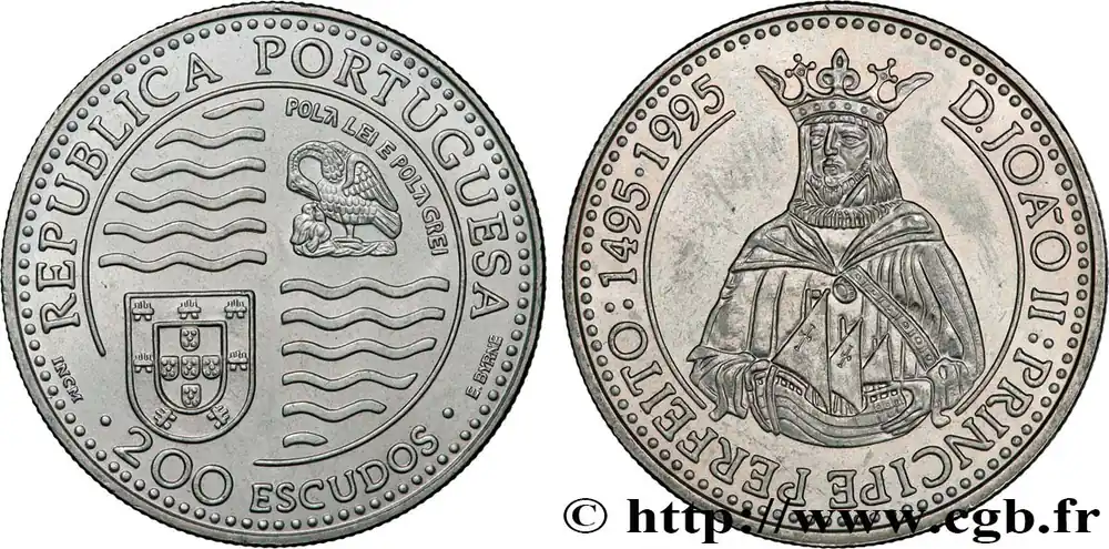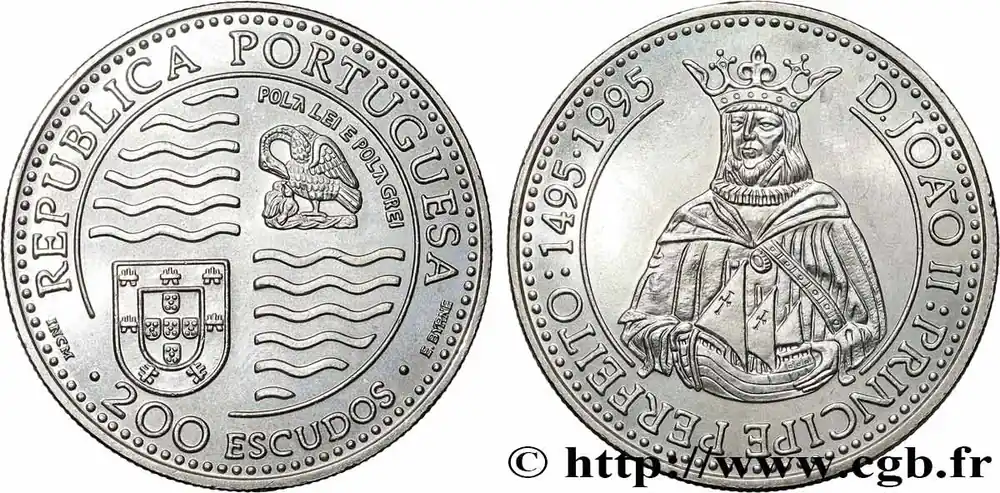 Type : 200 Escudos 500e anniversaire du règne de Jean IIDate : 1995Quantité frappée : 750000Métal : cupro-nickelDiamètre : 36 mmAxe des coins : 6 h.Poids : 21,18 g.Tranche : canneléeRéférence ouvrage :KM20/673  – Gom.113.01 AversTitulature avers : REPUBLICA PORTUGUESA // 200 ESCUDOS.Description avers : ondes, écu du Portugal, symbole du roi Jean II (pélican nourrissant ses petits avec devise ” POLÁ LEI E POLÁ GREI “).ReversTitulature revers : D. JOÁO II : PRINCIPE PERFEITO : 1495.1995.Description revers : portrait du roi Jean II tenant une maquette de voilier.HistoriquePORTUGAL