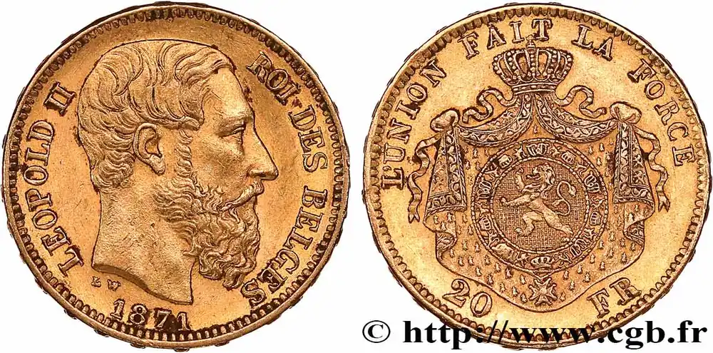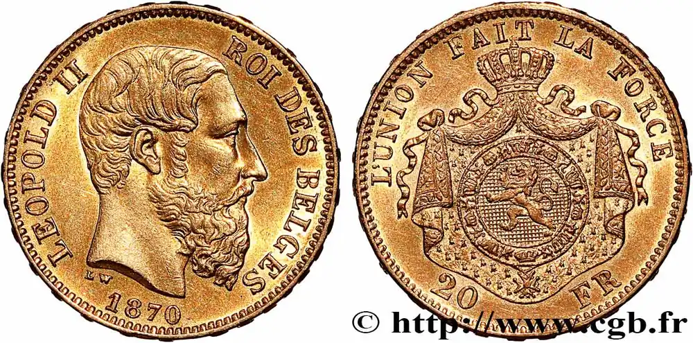 Type : 20 Francs Léopold IIDate : 1876Nom de l’atelier/ville : BruxellesQuantité frappée : 2009682Métal : orTitre en millième : 900 ‰Diamètre : 21 mmAxe des coins : 6 h.Poids : 6,46 g.Tranche : inscrite en relief ***** DIEU* PROTEGE* LA* BELGIQUERéférence ouvrage :DMP1556  – Morin141  – F.8 AversTitulature avers : LEOPOLD II – ROI DES BELGES/ 1876.Description avers : Tête nue de Léopold II à droite ; au-dessous L W.ReversTitulature revers : L’UNION FAIT LA FORCE.Description revers : Écu entouré du collier de l’Ordre de Léopold posé sur un manteau couronné ; 20 – FR.CommentaireCe type est fabriqué suite à l’arrêté royal du 15 mars 1867. 28.641.770 pièces furent frappées entre 1866 (sic !) et 1882 et démonétisées en 1928. Il existe quatre types différents pour les pièces de 20 francs or. En 1870, le premier, le troisième et quatrième type ont été utilisés.HistoriqueOR, PALLADIUM ET PLATINE INVESTISSEMENTSécurisez et diversifiez votre épargne avec les métaux précieux :Dans un contexte d’instabilité politique et économique croissante, diversifier son épargne peut être une démarche judicieuse. Les métaux précieux comme l’or, le palladium et le platine constituent des actifs tangibles souvent prisés en raison de leur caractère intemporel et de leur résilience face aux fluctuations des marchés.Pour répondre à des besoins variés, l’achat de pièces officielles en or, palladium ou platine est une option flexible et adaptée. Ces pièces, disponibles à l’unité ou en lot, permettent à chacun d’ajuster ses choix selon ses objectifs et son budget, sans engagement à long terme.Un processus simple et sécurisé :Nous proposons une livraison sécurisée et garantie. Les paiements peuvent être effectués par carte bancaire ou par virement, bien que certaines transactions puissent nécessiter un règlement exclusivement par virement bancaire. Une pièce d’identité valide (carte nationale d’identité ou passeport) sera demandée pour finaliser votre achat.Stockage en toute sécurité et confidentialité :Le département Investissement de CGB Numismatique Paris met à votre disposition des solutions de stockage offrant une sécurité renforcée et une confidentialité optimale pour vos achats en or, palladium et platine.Contactez-nous pour plus d’informations :Pour toute question ou pour passer commande, prenez contact avec notre responsable des achats/ventes de métaux précieux : par email à [email protected] ou par téléphone. Nous mettons à votre disposition des informations générales et des services pour vous accompagner dans vos projets d’investissement.CGB Numismatique Paris agit en tant que fournisseur de métaux précieux et ne fournit aucun conseil en investissement. La valeur des métaux précieux peut fluctuer, et les performances passées ne garantissent pas les résultats futurs. L’achat de métaux précieux doit être considéré comme une stratégie de préservation de valeur plutôt qu’un investissement spéculatif. Conformément à l’article L.221-28 du Code de la consommation, le droit de rétractation ne s’applique pas aux achats d’or d’investissement, dont le prix dépend des fluctuations des marchés financiers.