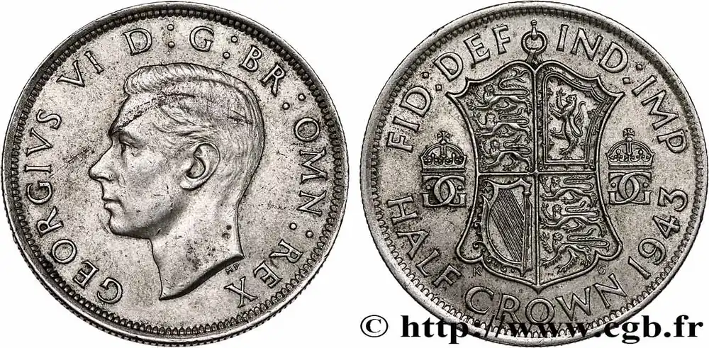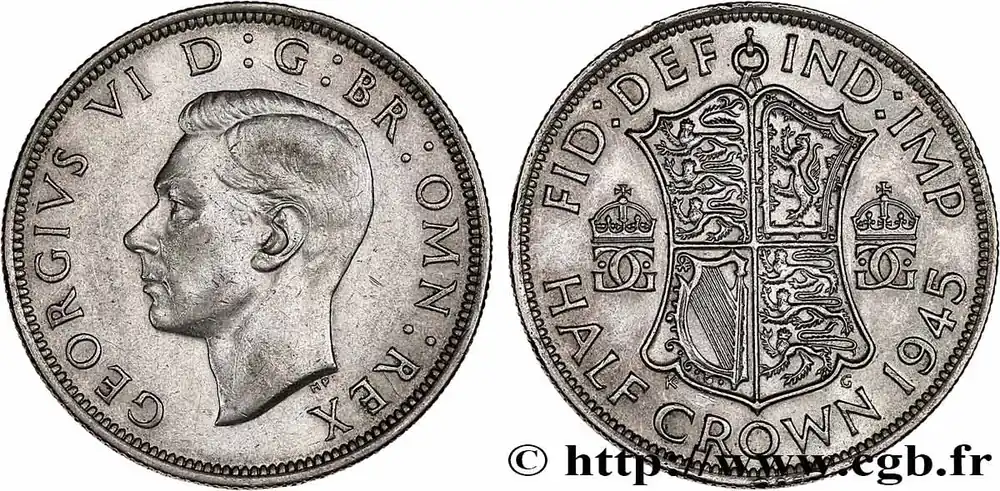 Type : 1/2 Crown Georges VIDate : 1940Quantité frappée : 17948400Métal : argentTitre en millième : 500 ‰Diamètre : 32 mmAxe des coins : 12 h.Poids : 1411 g.Tranche : canneléeCommentaires sur l’état de conservation :coups sur trancheRéférence ouvrage :Sp.4080 – KM20/856 AversTitulature avers : GEORGIVS VI D:G:BR:OMN:REX.Description avers : portrait à gauche du roi Georges VI.ReversTitulature revers : FID:DEF-IND:IMP // HALF CROWN 1940.Description revers : lettres G entrelacées et couronnées de chaque côté d’un écu.HistoriqueROYAUME-UNI