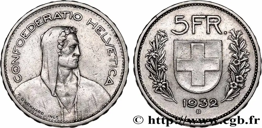 Type : 5 Francs Berger des alpesDate : 1954Nom de l’atelier/ville : BerneQuantité frappée : 6600000Métal : argentTitre en millième : 835 ‰Diamètre : 31 mmAxe des coins : 6 h.Poids : 15,00 g.Tranche : tranche en reliefCommentaires sur l’état de conservation :Monnaie nettoyéeRéférence ouvrage :KM20/40 AversTitulature avers : CONFOEDERATIO HELVETICA.Description avers : Buste drapé à droite.Traduction avers : (Confédération helvétique).ReversTitulature revers : 5FR // 1954 / B.Description revers : écu entre deux rameaux.HistoriqueSUISSE
