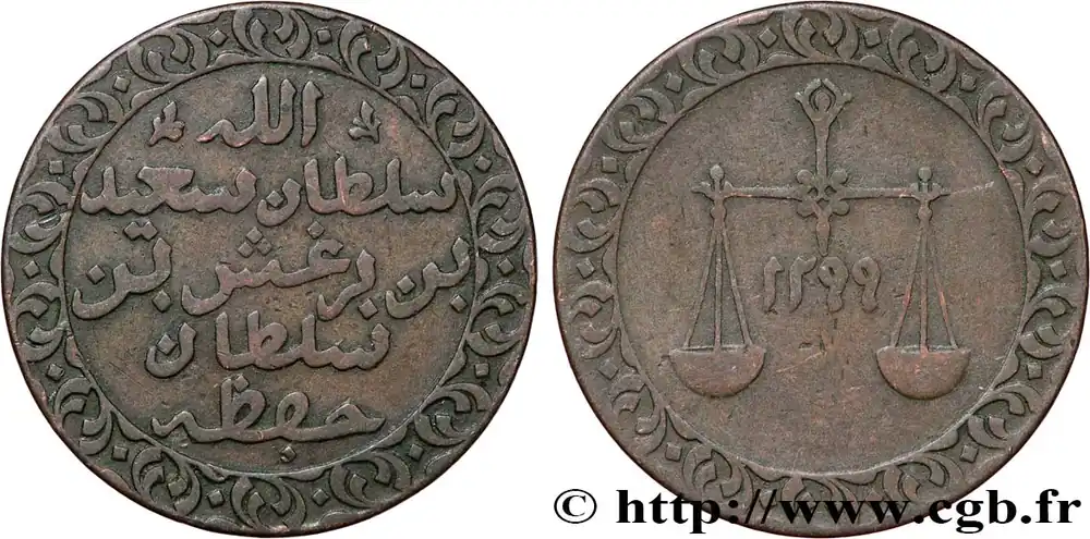 Type : 1 Pysa au nom du Sultan Barghash Ibn Sa’Id AH 1299Date : 1882Nom de l’atelier/ville : BruxellesQuantité frappée : 4640000Métal : cuivreDiamètre : 25 mmAxe des coins : 6 h.Poids : 6,46 g.Tranche : lisseCommentaires sur l’état de conservation :légers coups sur les listelsRéférence ouvrage :KM19/1 AversTitulature avers : (LÉGENDE EN ARABE).Description avers : dans le champ.ReversTitulature revers : DATE 1299 EN ARABE.Description revers : dans le champ, balance.CommentaireEn 1861, le sultanat de Zanzibar s’affranchit de la tutelle du sultanat d’Oman et devient indépendant. En 1890, un protectorat britannique est établi.HistoriqueZANZIBAR